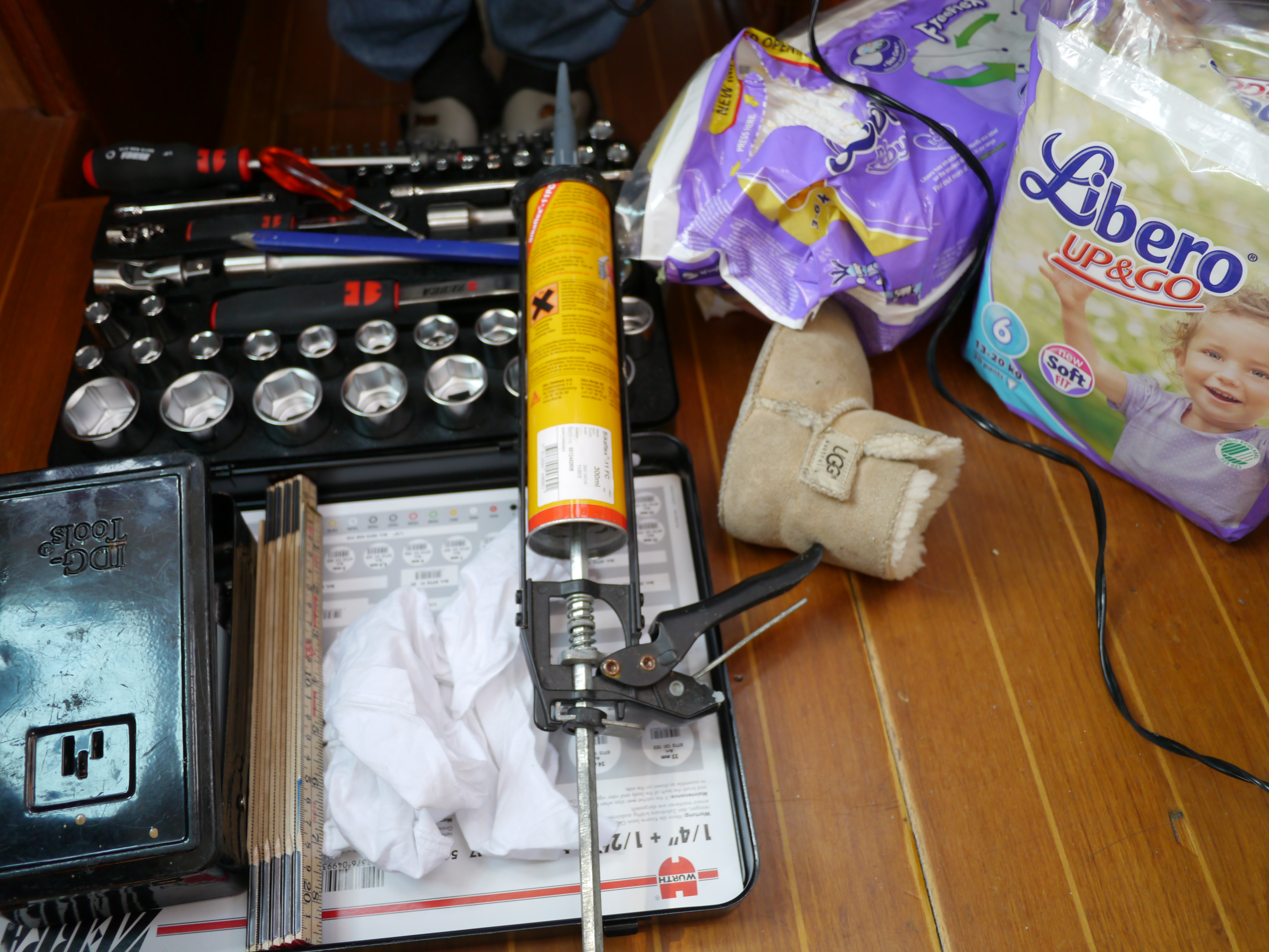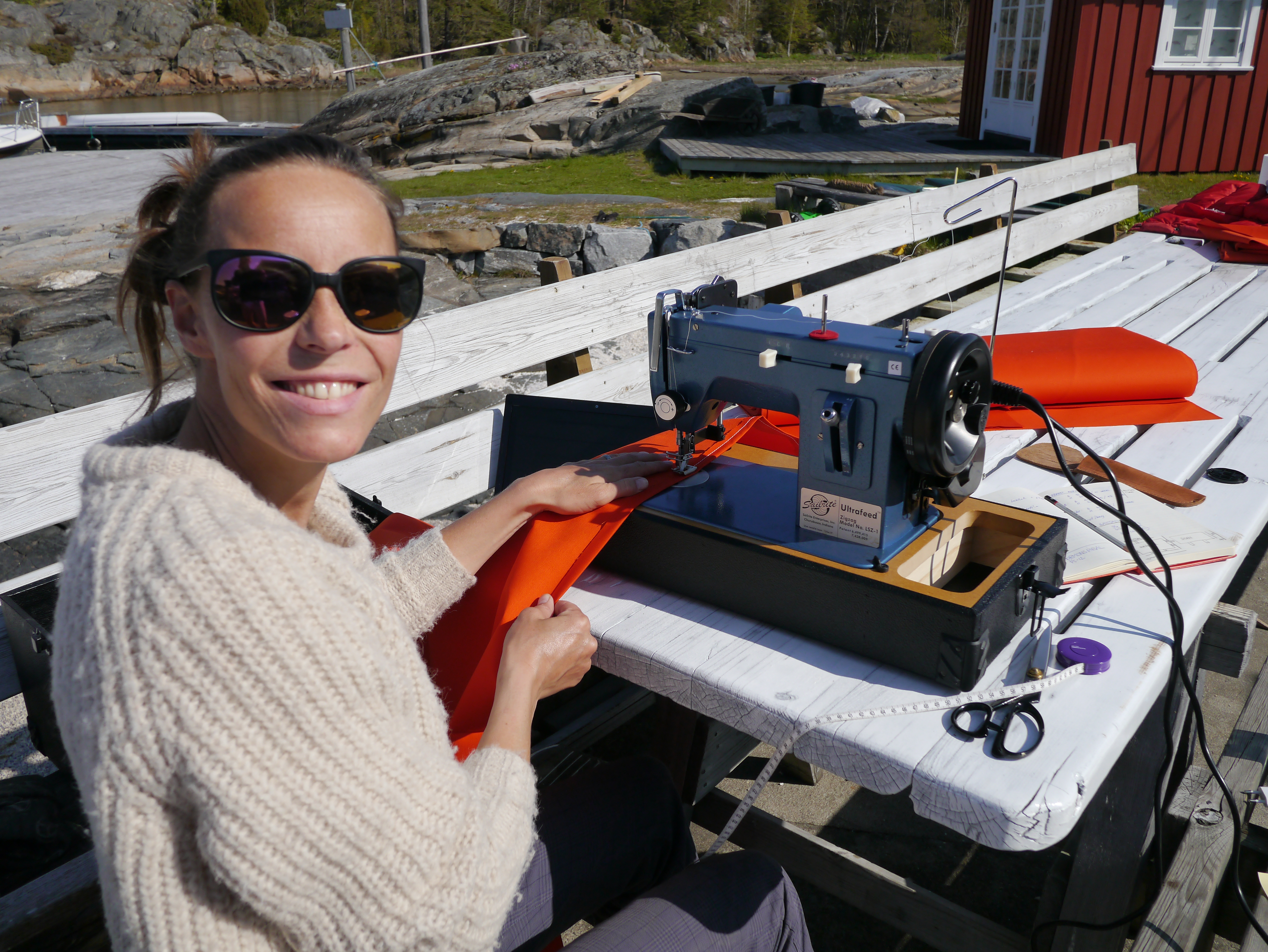 Vi har fått symaskinen (Sailrite, en seilmakermaskin importert fra USA) opp og gå og den syr gjennom alle lagene med kraftig stoff som vi har prøvd hittill (sinnsykt mye mer bråkete enn symaskinen hjemme, men…). Så nå er lebrett i rekkeportene på plass + at vi har sydd lebrett til alle køyer.