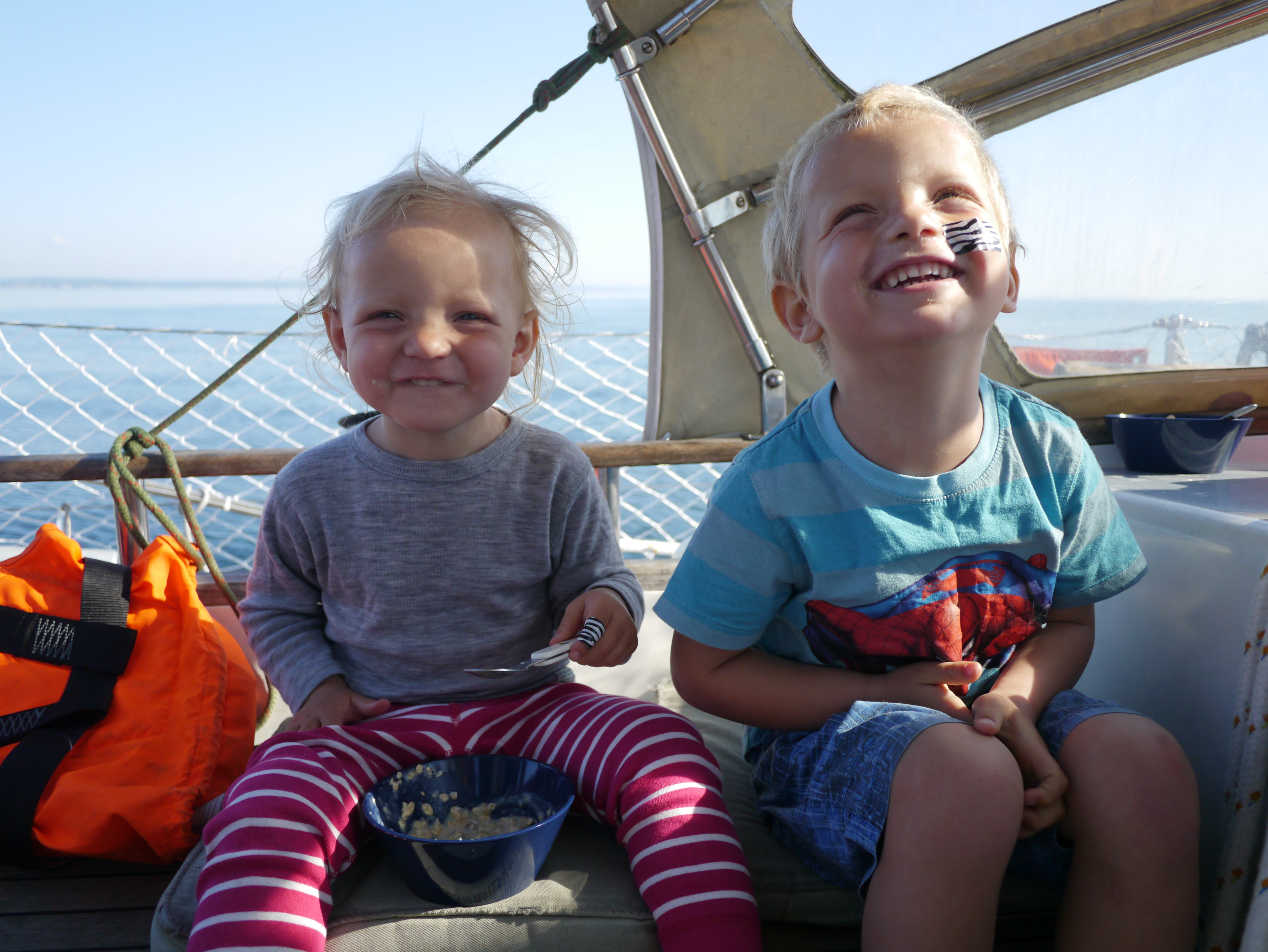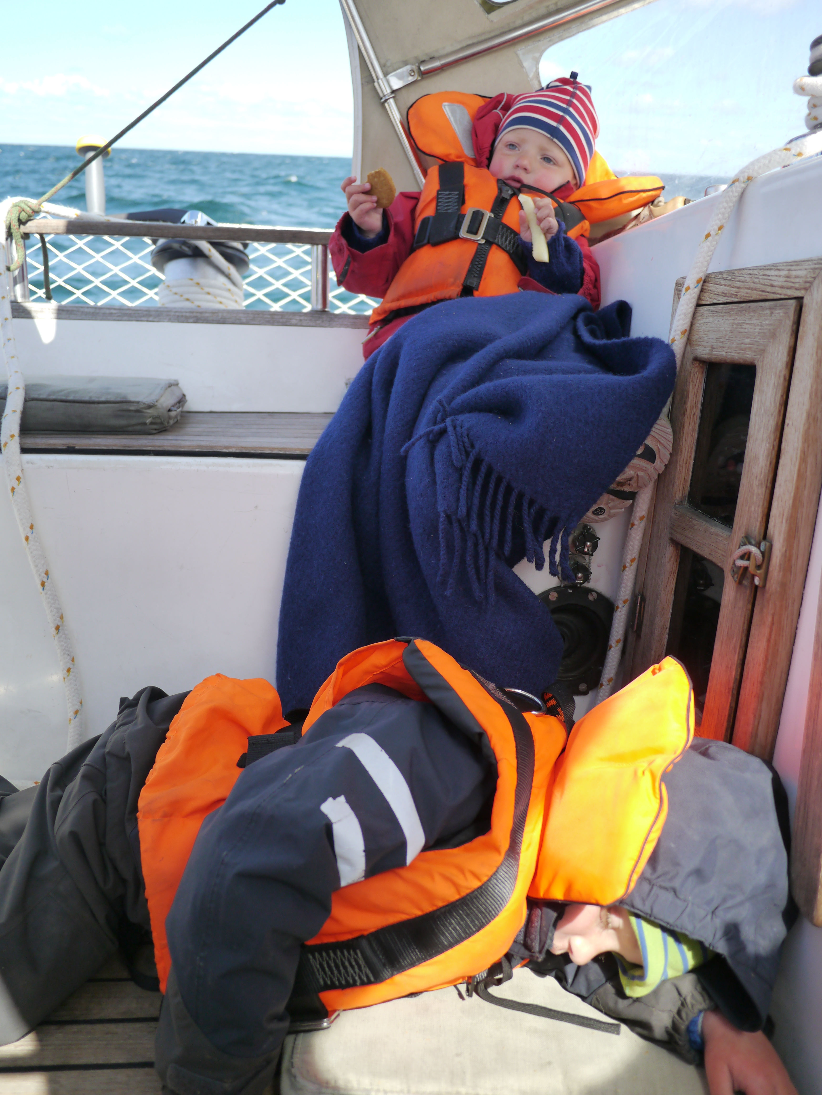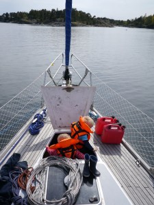 Og ikke alt varer evig. Som om det var noen overraskelse, så våknet småmatrosene en etter en, sånn passe fornøyde, og det ble nok å gjøre både over og under dekk… Det hele toppet seg da det viste seg at våre to eldste barn har en svakhet når det kommer til sjøsyke… Så vi fløy som strikkballer i et forsøk på å tilfedsstille småmatrosenes ønsker og behov (vasking av oppkast, bleieskift, tørking av oppkast, aktivisering/leking, oppmuntring, servering av mat/drikke og det som virket som tusen andre ting), i tillegg til seiltrim og krevende roring.