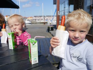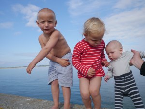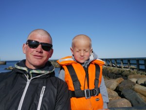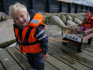 Barna sov mye av turen, seilingen gikk unna og vi gjorde opp mot 11 knop på surfen. På ni timer underveis hadde vi en snittfart på 7,8 knop! Vi var glade da vi kom inn bak den store steinmoloen i Anholt havn, og kunne løpe og le på brygga med Birk og Billie som fort pignet til. Mikkel var kul kis som sov de siste tre timene, og våknet ikke før bomtrekket var på, alle reveliner og skjøter kveilet opp og dekket utenfor cocpit + redningsvester spylt. Heldigvis følte ikke Billie eller Birk så mye på det å kaste opp eller være uggen som mange av oss voksne gjør: «Jeg gulpet tre ganger jeg, mamma», sa Birk lystig etter at vi var kommet inn. Og Billie fulgte stolt opp: «jeg også gulpet, mamma»! Vi håper selvfølgelig at det ikke er noe vi kommer til å slite mye med om bord, men det vil tiden vise…!