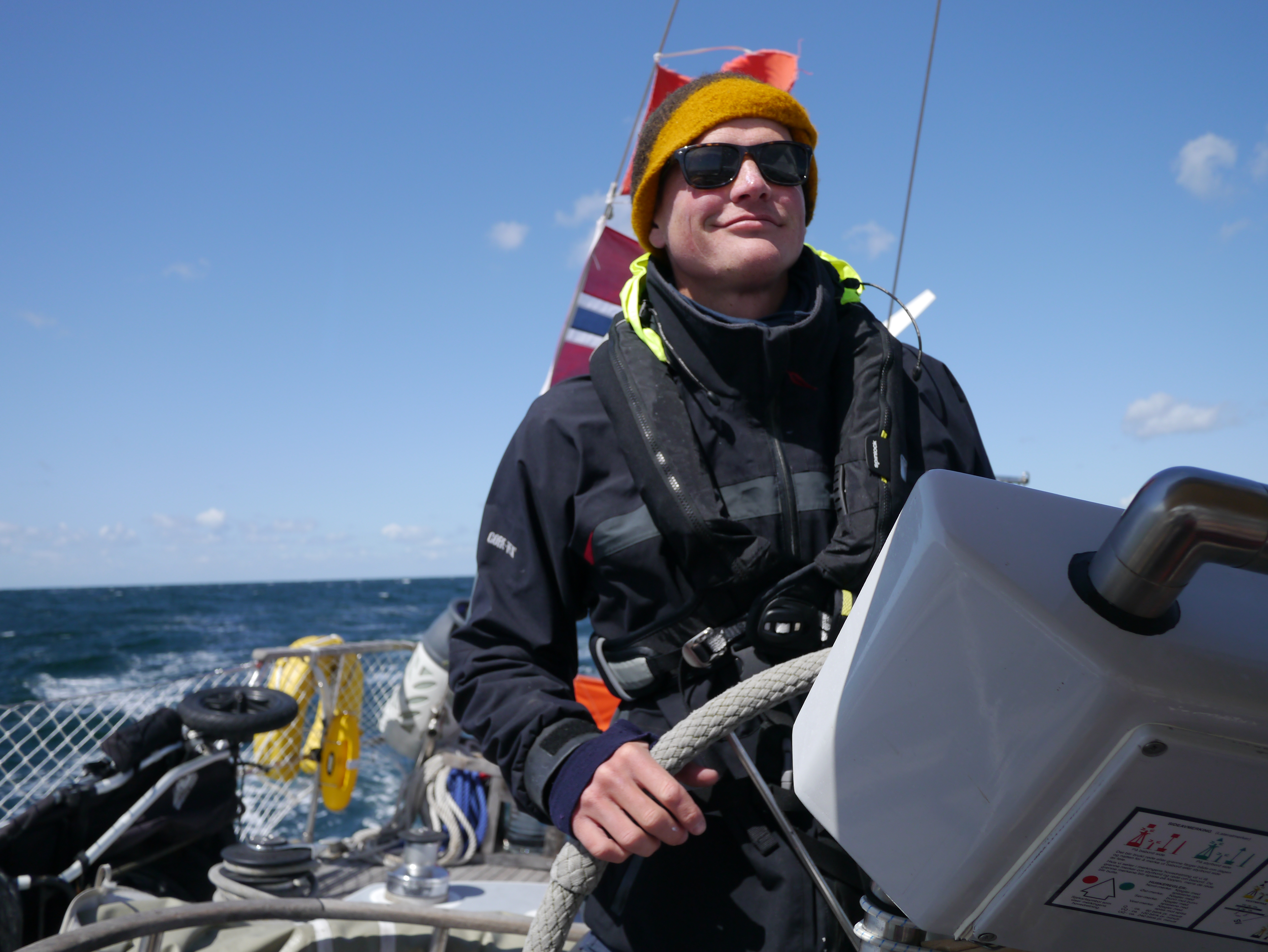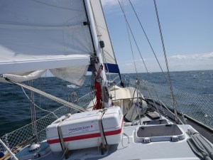 Dansk Meterologisk Institutt hadde meldt om avtagende vind fra midt på dagen av, og uten å si noe stygt om instituttet, var det jevn liten kulig med kuling i kastene og grov sjø nesten bakfra som var realiteten midt uti Kattegat. Det ble vel vår første leksjon i at man ikke alltid kan stole på værvarselet…
