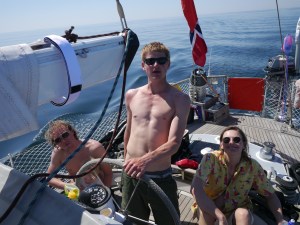 Det er god karma om bord, de nye matrosene er veldig happy med å være med på første havkryssing, og lærer ivrig pålestikk og å sette sjøbein (cocpit fungerer godt som lekegrind og Indie finner seg snart i å måtte bruke vest). Tror turen over funket fint for de minste også, det var høyt aktivitetsnivå, mange behov som måtte tilfredsstilles og tilløp til konflikter de første par timene, men så fant de roen og det ble så harmonisk som det kan bli med fire barn under 4 år om bord uten landkjenning. Utrolig hvor lenge en lekebåt på slep kan være spennende å følge med på… Ellers liker de å leke nede under dekk og holder ganske lenge på egenhånd, helt til vi ikke lenger kan ignorere høye skrik med «MIIIIN» og «NEEEEI». Da er det fint med høytlesning i cocpit, etter en heftig diskusjon om vesten må på eller ikke (og det må den!).