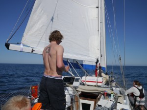 Da er vår første havkryssing (over Skagerrak) vel gjennomført – første halvdel av turen under ekstreme sommerforhold: ikke en sky på himmelen, blikkstille vann og lettkledd crew. Noe som selvfølgelig også betyr en snill seilas fra hjemland til utland.