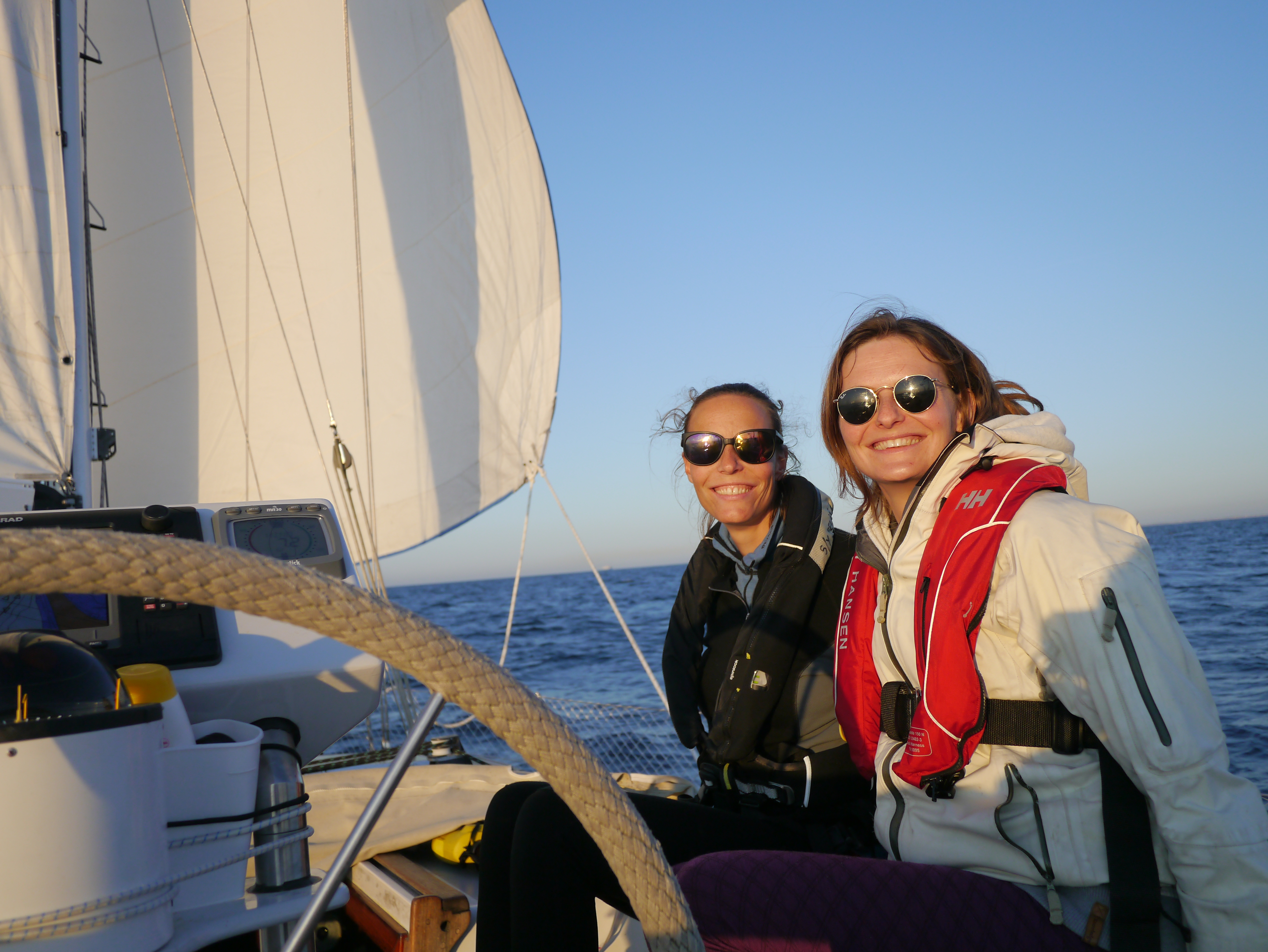 Det er viktig å kose seg om bord og vi hadde herlig servering hele dagen, med kreolsk fiskesuppe i koppen til formiddags og feilsodd til kvelds, og en haug av mellommåltider imellom! Kidsa ble lagt på vei over og sov godt (Birk og Billie i midtlugaren og Indie i forpiggen), tror de synes det er deilig å sove til båtens vugging og lyder. Og det gjør jo at vi kunne nyte kveldsro for fulle seil i solnedgangen, mens vi ser land og etterhvert kan begynne å lete etter nordmerket på Skagens rev.