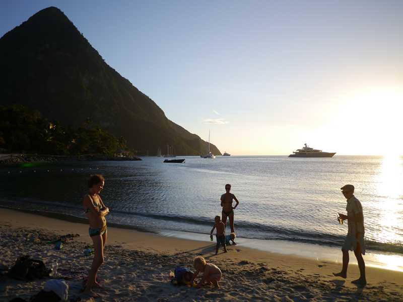 I kontrast til Suffreare slipper vi ankeret i Jealousy Bay, som ligger rett under et av fjellene som utgjør The Pitons. Dette viser seg å være en high life beach resort på Sugar Beach og det er selvfølgelig masse å se på… (veldig fascinerende med rikinger…!). For oss ble det en fin ettermiddag med Piton øl i solnedgang på beachen. Birk synes det er stas med dykkermasken og vi ser Nemo-fisk og koraller! Den ene lett båten på 23 fot til en av megayachtene med tre ganger 350 hester og baugpropell imponerte og. Kjekk!