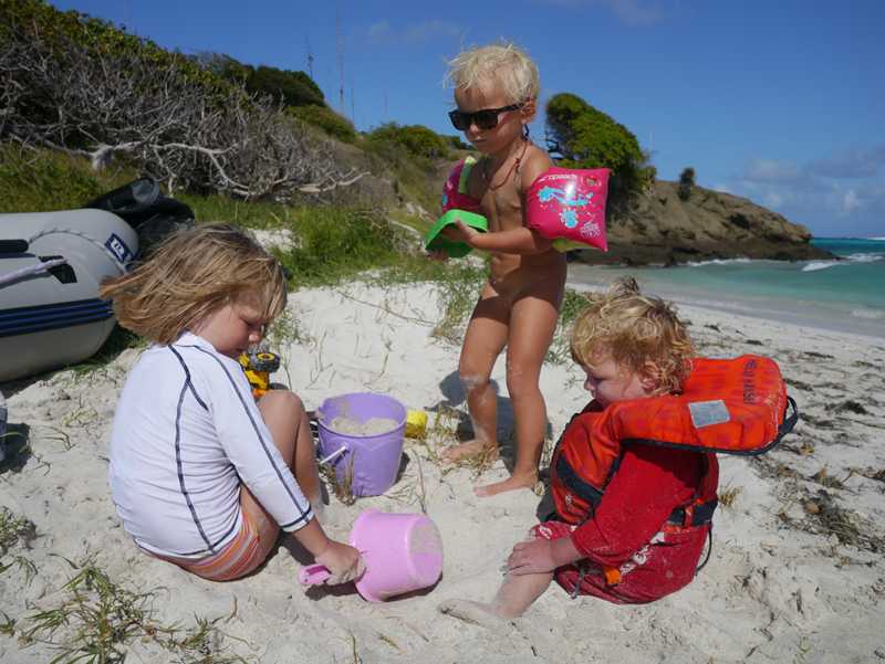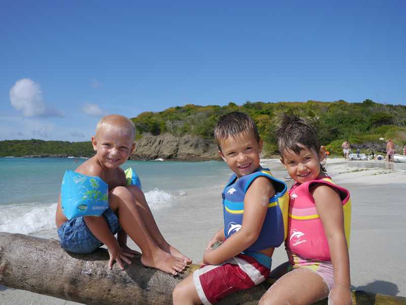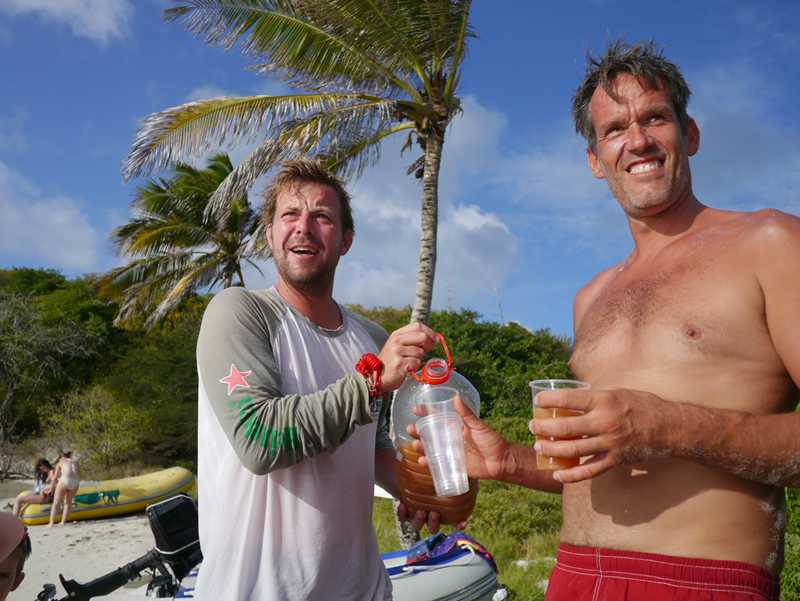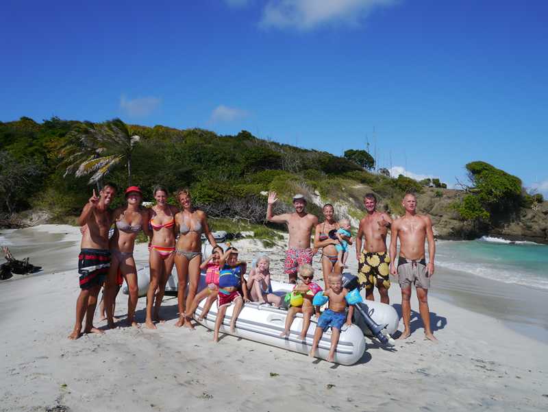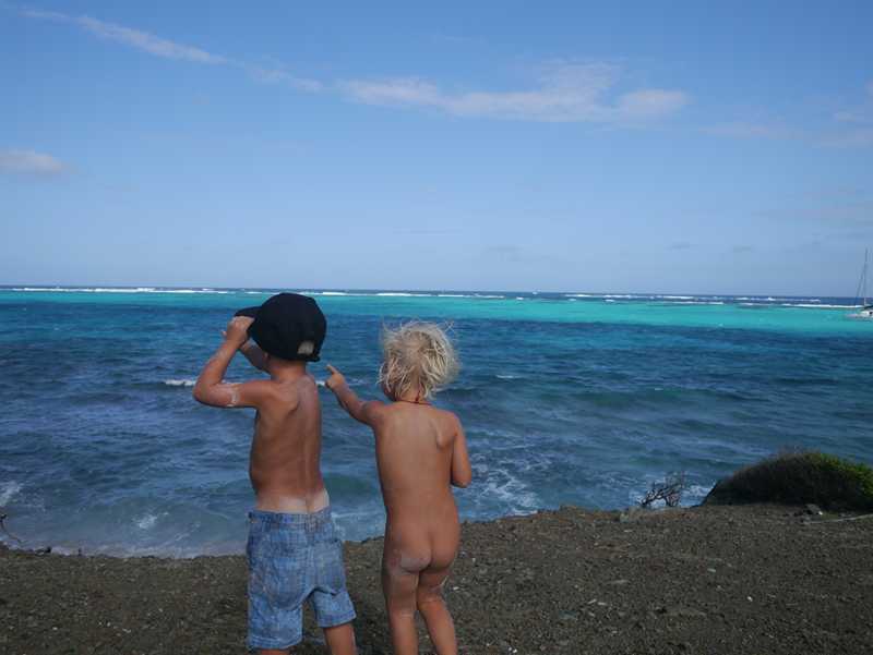 Vi har lagt oss rett ved siden av noen Nederlandske kompiser, Pieter og Sabine (med tre jenter på 2, 4 og 6 år)) i båten Ostrea. Visste ikke at de var her, og har ikke sett dem siden Lanzarote, så det var en veldig hyggelig overraskelse! Dessverre har de bare ett år og er på vei nordover. Pieter er en over snittet sosial og trivelig fyr, og det tar ikke lang tid før vi står på en av strendene og drikker hans rum-punch i 5 liters-dunk hele gjengen! Nikola og jeg er glade for at de også har tatt med pannekaker til alle kidsa, det letter på samvittigheten ettersom småmatrosene hadde levd litt vel mange timer på salte kjeks den dagen…! Dette var også etter vårt første møte med svellen på en av de andre strendene her. Der var det så store bølger så turen derfra ble en våt affære…! Men selv Mikkel, som fikk seg en skikkelig dusj, smilte og lo!