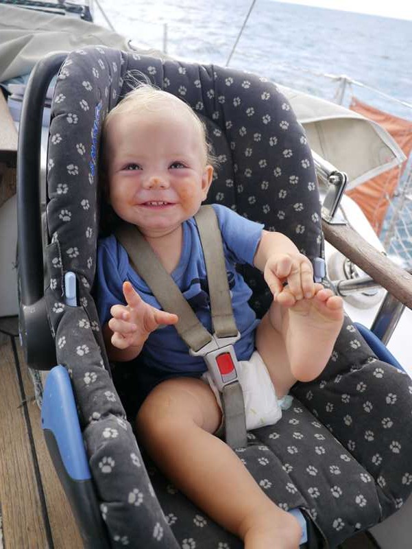 Ellers har Mikkel begynt å klatre opp hele trappen fra salongen og opp til cocpit! Pluss at han kommer seg fra gulvet i cocpit og opp på benken, og derifra er veien kort ut av cocpit (enten med beina først eller på hodet…). Han og vi er selvfølgelig veldig stolte og det er kult at han blir større, men det betyr mer jobb (=fotfølges) og nye sikkerhetsrutiner når det gjelder minstematros.