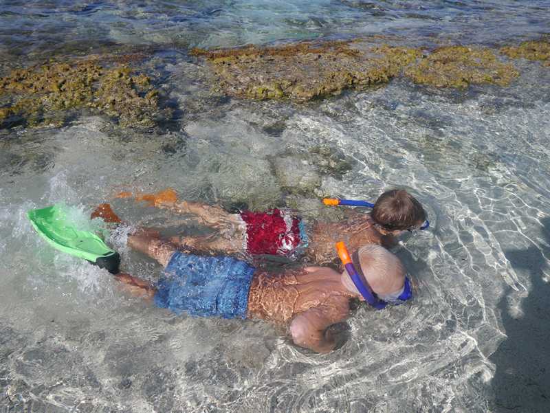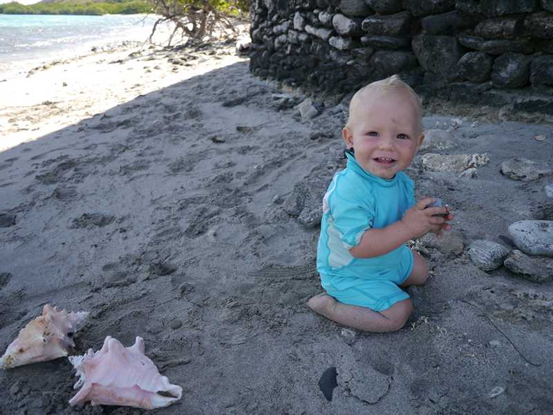 Vi har lagt oss rett ved siden av noen Nederlandske kompiser, Pieter og Sabine (med tre jenter på 2, 4 og 6 år)) i båten Ostrea. Visste ikke at de var her, og har ikke sett dem siden Lanzarote, så det var en veldig hyggelig overraskelse! Dessverre har de bare ett år og er på vei nordover. Pieter er en over snittet sosial og trivelig fyr, og det tar ikke lang tid før vi står på en av strendene og drikker hans rum-punch i 5 liters-dunk hele gjengen! Nikola og jeg er glade for at de også har tatt med pannekaker til alle kidsa, det letter på samvittigheten ettersom småmatrosene hadde levd litt vel mange timer på salte kjeks den dagen…! Dette var også etter vårt første møte med svellen på en av de andre strendene her. Der var det så store bølger så turen derfra ble en våt affære…! Men selv Mikkel, som fikk seg en skikkelig dusj, smilte og lo!