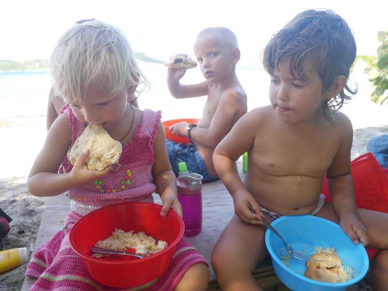 Og for å være helt ærlige, det er ikke alltid like lett å være så mange om bord som skal leve så tett sammen… Noe vi alle har fått erfare den siste tiden, men alle er også enige om at vi fant fint ut av det! Forskjellige forventninger til turen og oppholdet kan fort bli en utfordring. Vi Borkhuser lever jo dette livet, det er hverdagen vår og vi har ingen hast. Tvert imot vil vi gjerne oppleve steder så sakte som mulig for nettop å finne roen i hverdagen. Folk på besøk vil gjerne ha mange fete opplevelser, men har begrenset med tid og det betyr ofte at vi «fastboende» må forflytte oss raskere enn det vi egentlig kanskje ønsker oss. Det er selvfølgelig veldig viktig å ta en runde på dette før folk kommer, men det er ikke lett (eller mulig) å planlegge alt på forhånd. Været vil jo alltid være med på å bestemme tidspunkt for avreise, men det kan også være andre ting som gjør at noen vil bli lenger og andre vil stikke videre. Ikke lett dette her, for dette ER jo vår tur, men det er klart at besøkende også skal og må få være med på å bestemme om bord, men uten at vi føler at det ikke er vår tur lenger… Og det trengs vel ikke nevnes at det selvfølgelig blir baluba og sirkus med fire barn under fem år på så liten plass i ukesvis, ihvertfall når to sett med foreldre skal prøve å samkjøre måltider, hverdagsrutiner og oppdragelse…! Ha ha… Det vi tror er med på å få det til å funke, er at alle er så ærlige og direkte som man kan eller klarer, at alle prøver å være fleksible, at alle svelger en del kameler men ikke så mange at man begynner å føle på det, og å ta noen skikkelige samtaler underveis for å avstemme forventninger og for å «lufte ut» litt. For oss er det faktisk sånn at vi gleder oss veldig til å få besøk, men så gleder vi oss skikkelig til å bli bare oss igjen – og det er vel helt naturlig!?