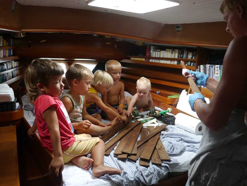 Rimelig kummelige kår uten do (ikke alltid like stas med bøtte på akterdekk) og en båt som har vært en herlig miks av kidsmania lekeplass og båtbyggeri med verktøy, glassfiberduk og malingspann overalt… Men det kjijpeste har vært en hissig mygginvasjon (merkbar forskjell med MYE med mygg på land, selv om vi bare lå noen meter fra vannkanten)… Det har vært netter med dårlig og lite søvn for alle, selv inni myggnett og vi har stiftet bekjentskap med ihvertfall to typer mygg som opererer på forskjellige tider av døgnet). Heldigvis har det vært oppholdsvær hele tiden mens vi stod på støtter, noe som har bidratt til at dekksreparasjonen gikk rimelig smooth, men komboen 33 grader, glassfiberstøv, solbrent og myggstikk er kjip! Kjempeinnsats fra alle!