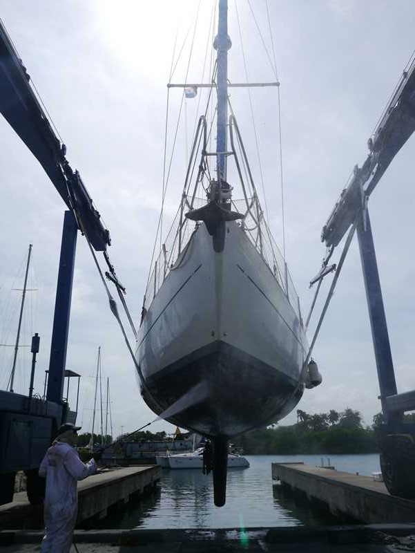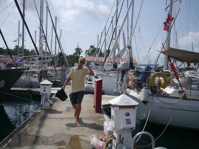 Etter et lite møte med Panamansk byråkrati (eller kran-kisens blåmandag?) vurderte vi å bestikke både han og sjefen hans for å være sikre på å komme oss ut av mygghullet og i vannet da vi var klare, istedenfor å måtte vente på kran-kisens luner. Uten forvarsel kom han allikavel og ropte : NÅ! – så da bar det ut!
