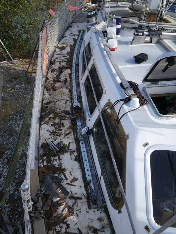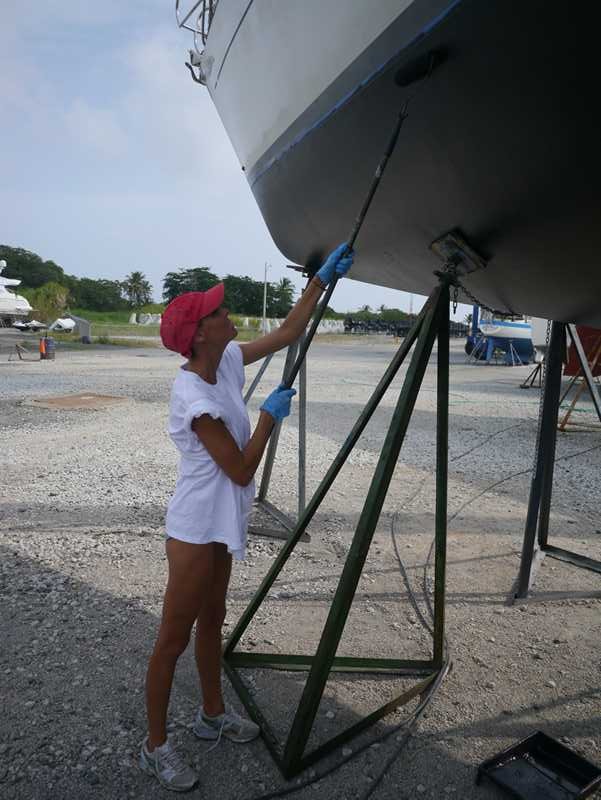 Og nå er undervannskroget vasket, pusset, primet og stoffet (med bunnstoff for panama tugboats), vi har nye anoder over alt og sist men ikke minst TETT DEKK på styrbord side (så nå trenger vi ikke lenger bekymre oss over fukt hverken i el- eller kjøkkenskap)! Vi kjører nå midlertidig en rimelig sjabby stil med seks meter glassfiberdekk (hvitmalt med antiskli) og teak på resten (det blir nok glassfiberdekk hele veien til jul).
