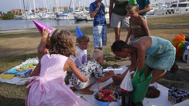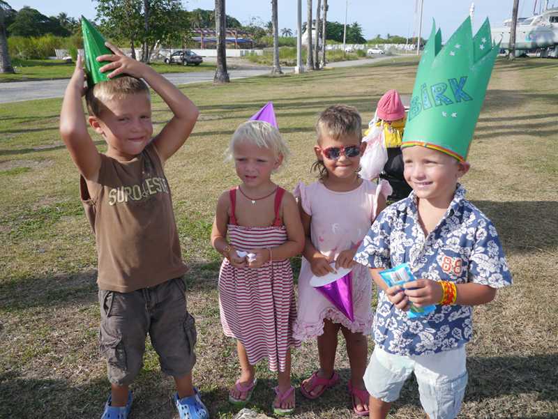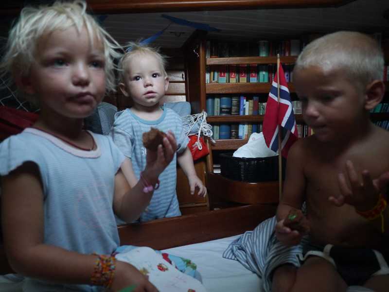 Bursdagen til Birk ble feiret i god tradisjon og det var kake og sang på sengen, bursdagsfest for alle vi kjenner i marinaen (masse barn!) med kaker, sang, ballonger, signalflagg, rebusløp, gele (den smelter i dette klimaet, så da vet vi at det ikke er noe å satse på neste gang…)! «Jeg merker faktisk at jeg er blitt fem år og ikke er fire lenger» mente Birk, men han digget ikke kronen…