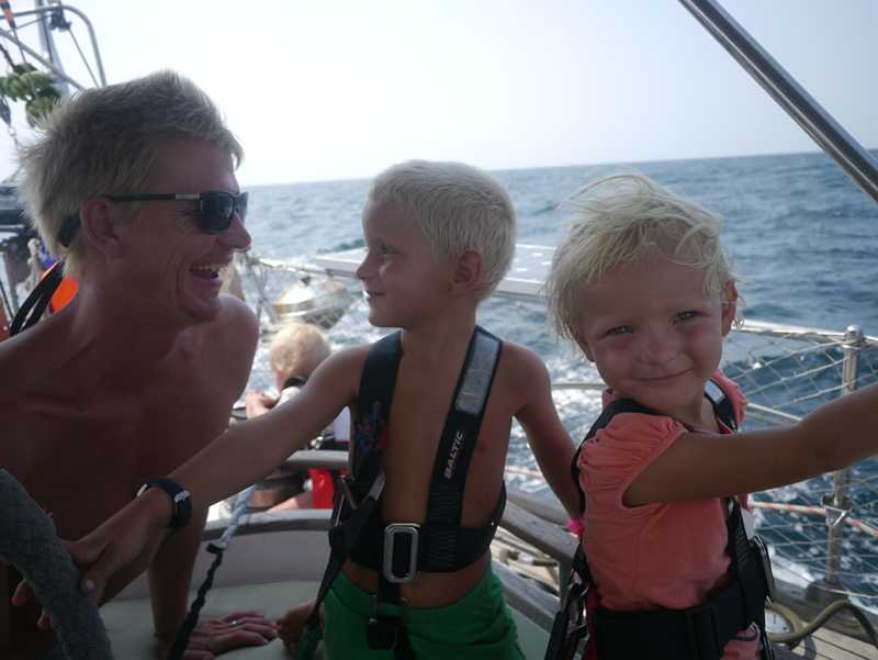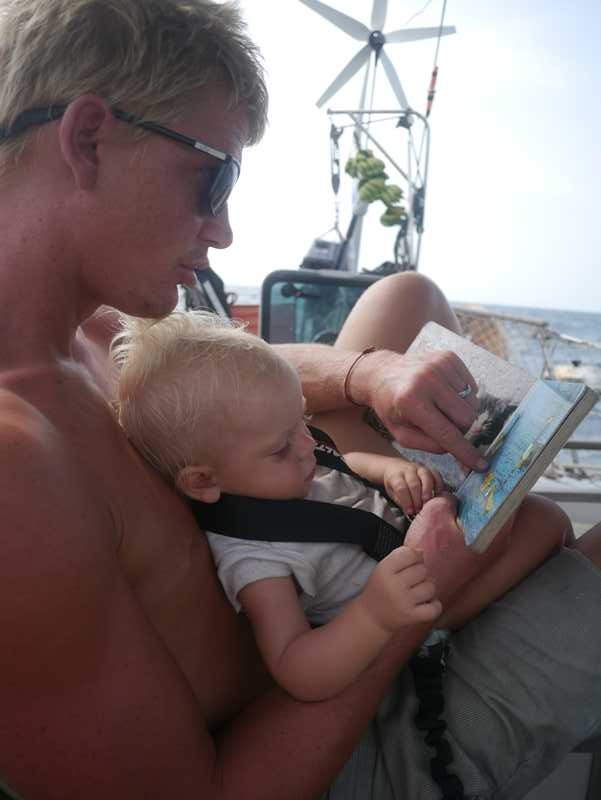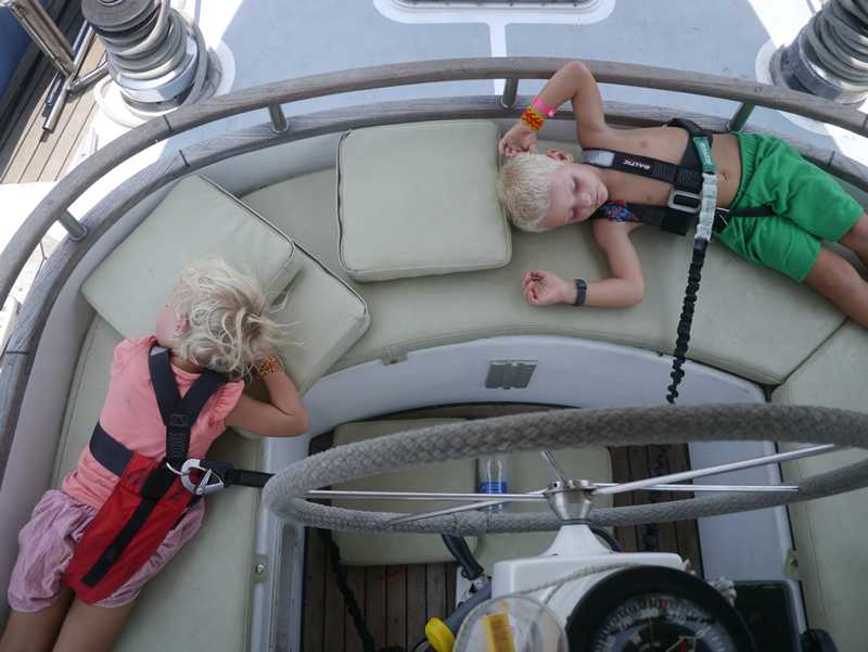 Så da vi hadde glemt hele snøret og det nappet godt etter en stund (og alle tre selvfølgelig var våkne) angret mama littegrann… Det var nemlig akkurat da Mikkel freaket på selen (de er festet i cockpit med sele og line, og dette er første gang Mikkel introduseres for det som den permanente løsningen når vi seiler) OG måtte byttes bleie på OG B+B plutselig samtidig innså at de var skrubbsultene og skrek etter knekkebrød OG det eneste som hjalp på Mikkel var en pupp OG jeg egentlig hadde begynt å lage middag OG vi oppdaget at vi var på kollisjonskurs med et fiskefartøy med trålen ute, som betyr at jeg med Mikkel på puppen må skru av autopiloten og manøvrere oss rundt fiskerne OG det kom en flokk med delfiner som B+B skulle se på så jeg måtte klipse om linene deres – DA beit en stor tuna på kroken så Jo var indisponert og det sprutet fiskeblod på hele akterdekk og kidsa digget det og papa var glad og mama var egentlig bare stressa og sur… «Akkurat som vi ikke har nok å drive med, så skal vi drive med fisking også!» (mama). «Jeg er glad for at det var din ide å slenge ut det snøret…» (Jo).