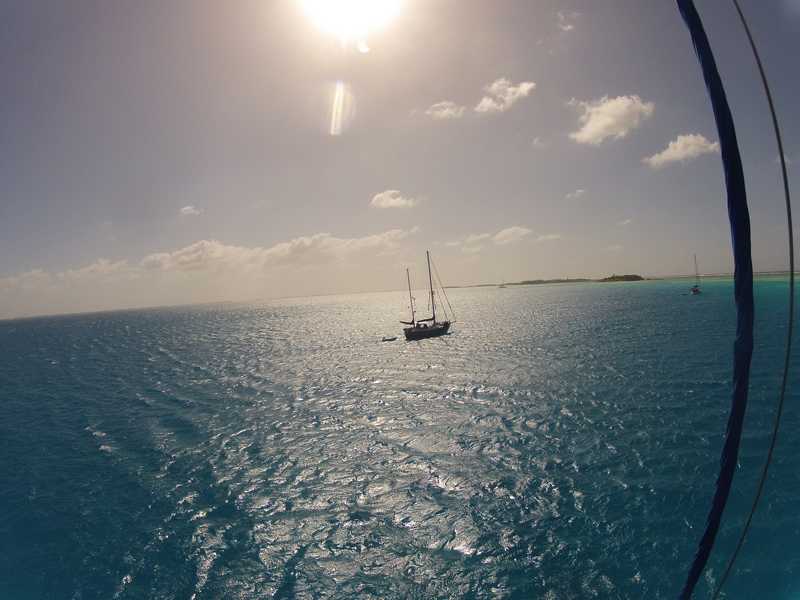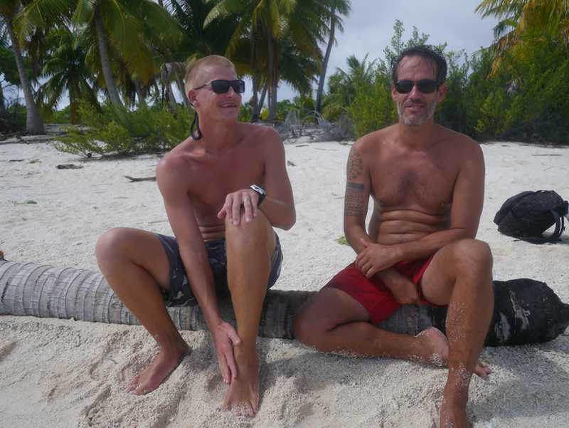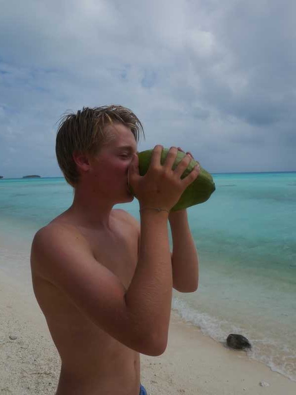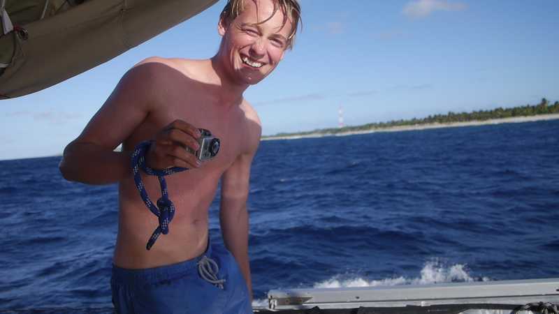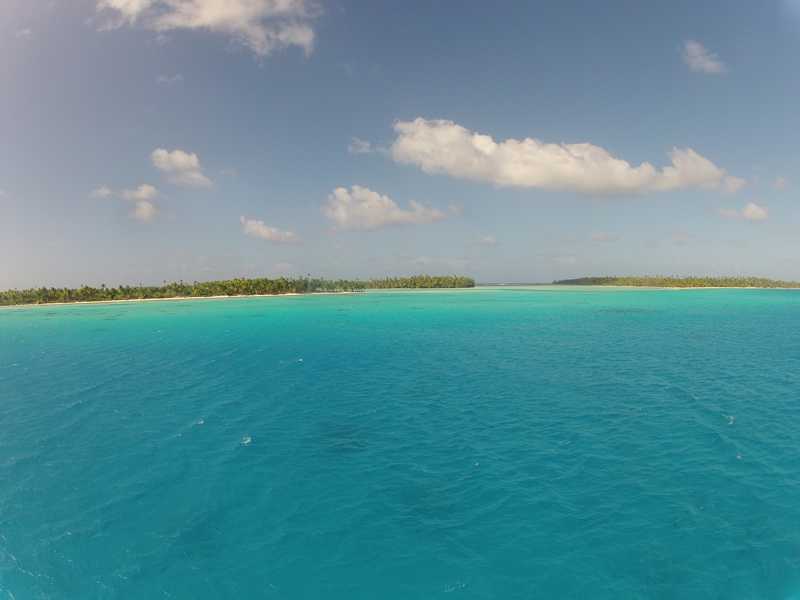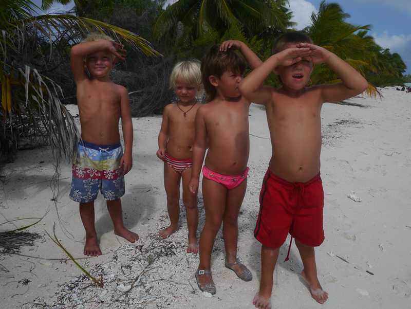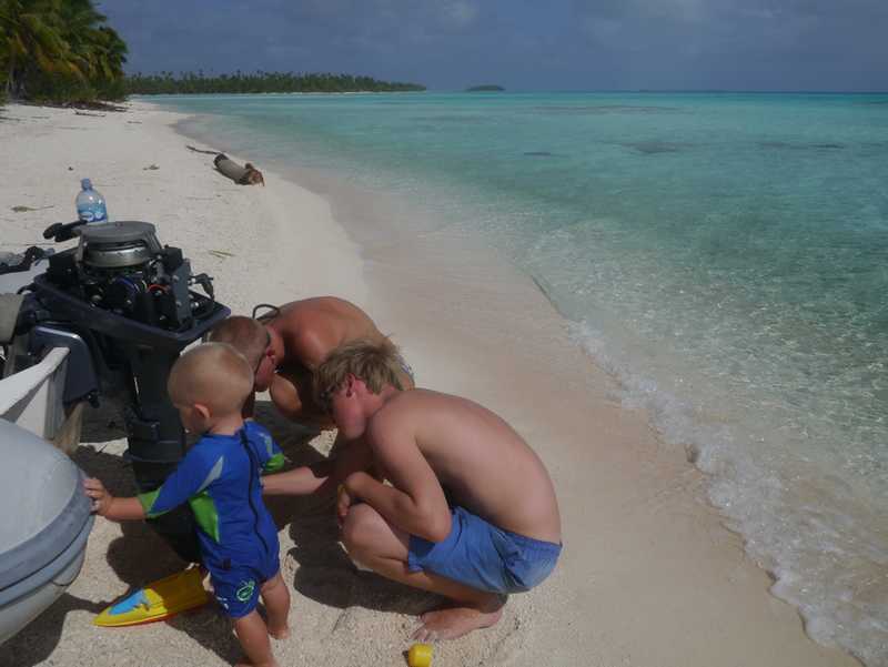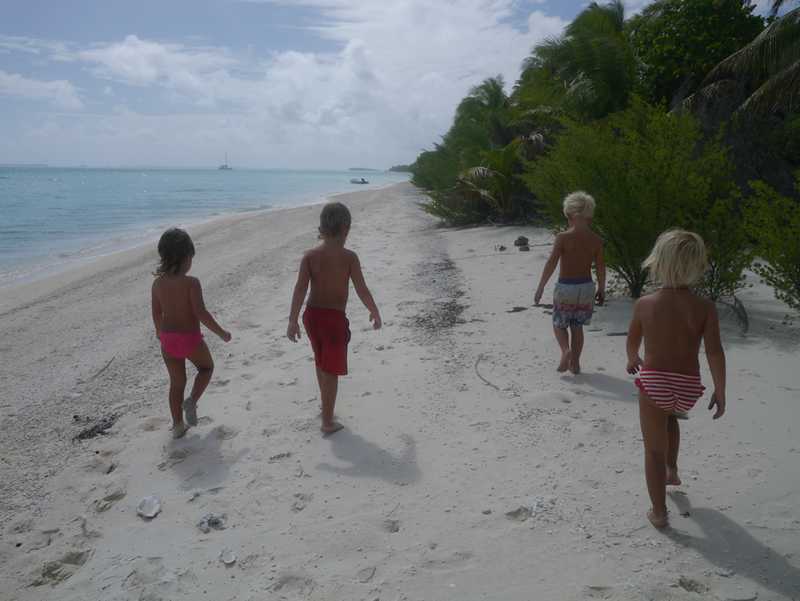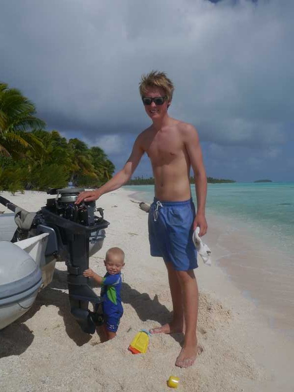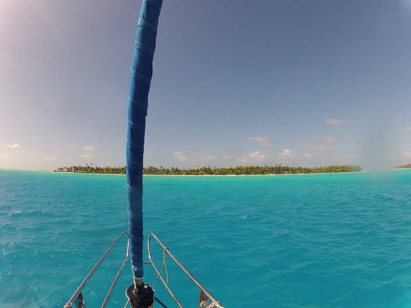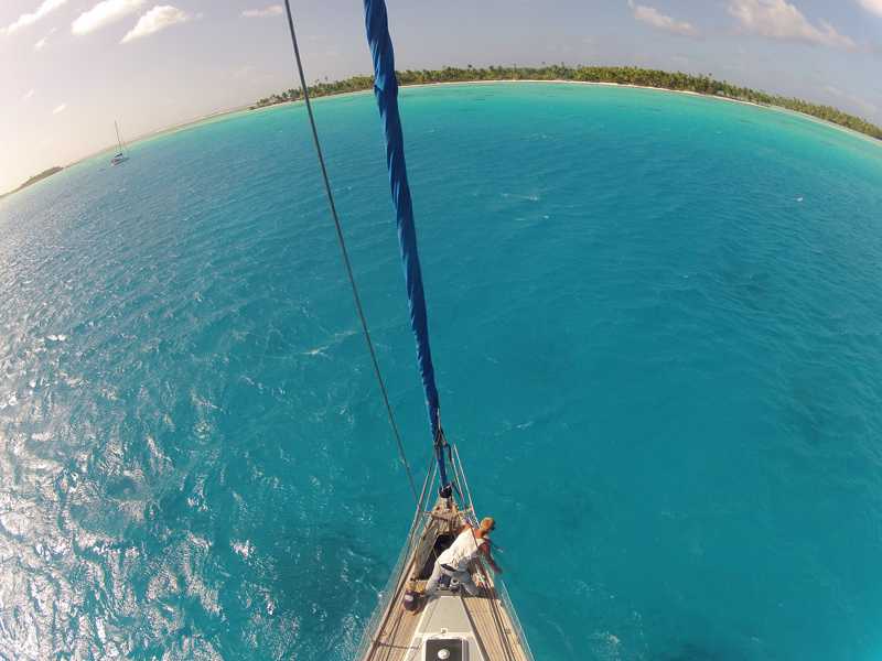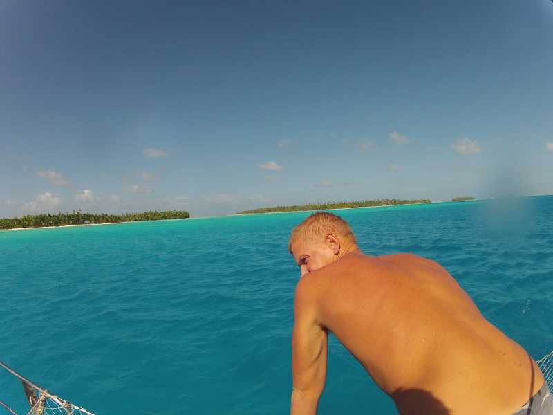 Til slutt var ankeret oppe, mens Nikola og Marcus hadde hatt god underholdning til morgenkaffen sin. På grunn av alle korallhodene og små-revene som er umerket i kartet og som ligger strødd rundt i lagunen, var det litt spennende å gå fra ankringsplassen og tilbake til slepesporet vårt da vi kom. Maria satt i masten 13 nautiske mil for å holde utkikk (det er ikke en eneste stake i hele atollen som markerer grunt farvann, men det er MYE av det…!). Fordelen med å sitte der oppe, rent bortsett fra et pusterom fra mas og småbarnsfeider i cockpit, er utsikten: store bølger fra havet som skummende bryter på det ytre revet i atollen, motusene med en kritthvit stripe sand mot det turkise vannet, og de grønne palmekronene mot klarblå himmel – oh så vakkert!