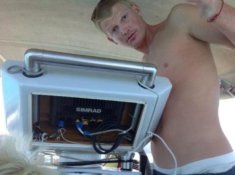 Vi er sånn passe imponert over kundeservice, frakttjeneste og effektiviteten hos leverandør, importør og den det lokale tollkontoret (har litt følelsen av at alle som har hatt noe med prosessen å gjøre enten har surret eller gjort noe feil…). Til slutt måtte vi virkelig ta saken i egne hender (det skal nevnes at Jo den siste måneden har vært på telefon hver dag med alle involverte ledd for å være sikker på at NOE skulle skje). Jakten på plotteren endte med at Jo og Birk kjørte Bora Bora rundt MED JOLLA først til flyplassen, så til kontoret i landsbyen, og så tilbake igjen andre veien. Det ble en tur på 16 nautiske mil med 8 Hk. De kom jublende tilbake, med god og luftig hårsveis, og Jo skal nok slite litt med kjernemuskulaturen de neste dagene etter en heller statisk øvelse med påhengeren.