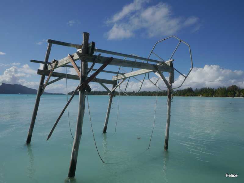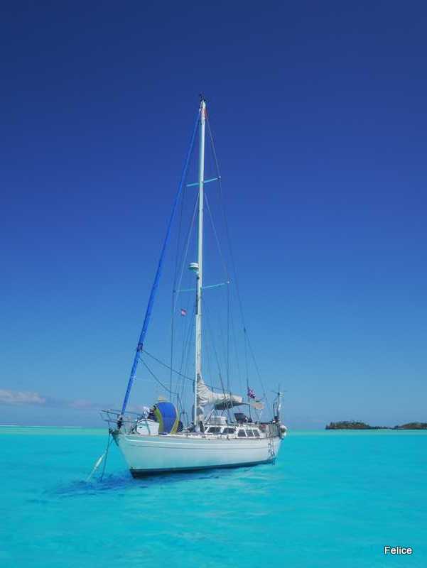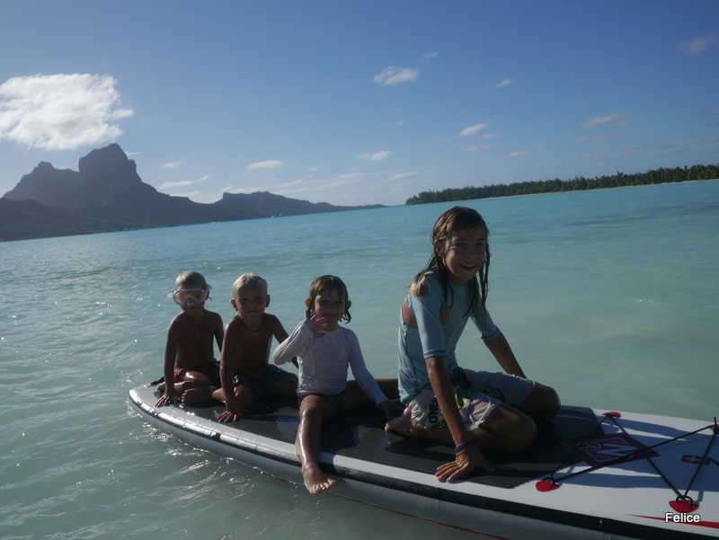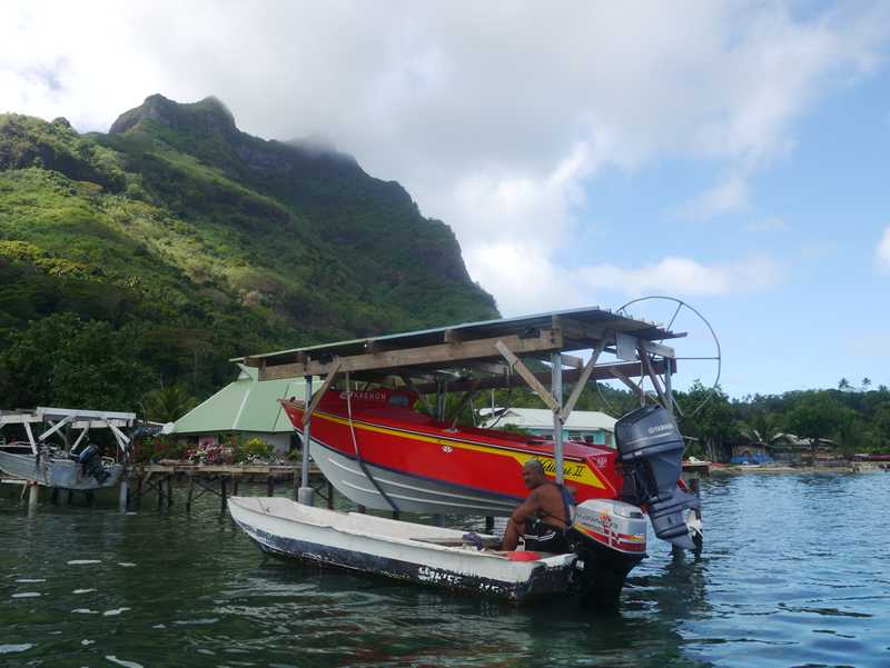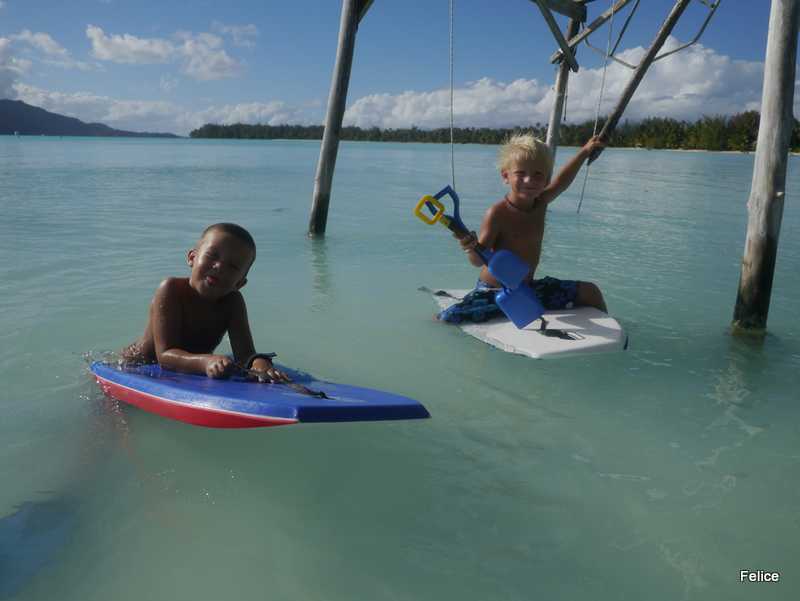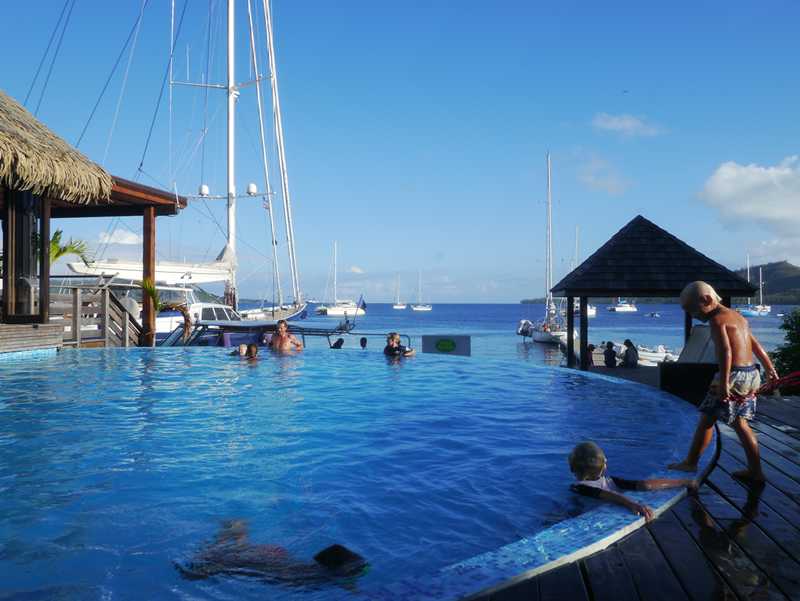Vi hadde et lynstopp en natt og to i bøye ved Bora Bora Yacht Club (Mai Kai Marina), like ved den lille landsbyen Vaitape her. Etter en ukes tid for anker i øde bukter på forrige atollen Tahaa, var det greit med klesvask, butikk og litt luksus med svømmebasseng. Og Birk stuper! Mange kjente og veldig trivelig.