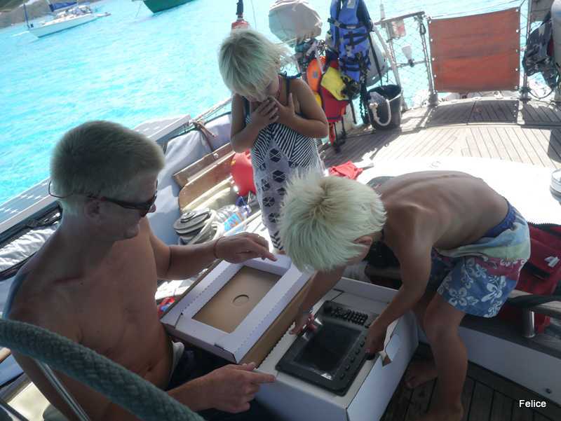 Vi er sånn passe imponert over kundeservice, frakttjeneste og effektiviteten hos leverandør, importør og den det lokale tollkontoret (har litt følelsen av at alle som har hatt noe med prosessen å gjøre enten har surret eller gjort noe feil…). Til slutt måtte vi virkelig ta saken i egne hender (det skal nevnes at Jo den siste måneden har vært på telefon hver dag med alle involverte ledd for å være sikker på at NOE skulle skje). Jakten på plotteren endte med at Jo og Birk kjørte Bora Bora rundt MED JOLLA først til flyplassen, så til kontoret i landsbyen, og så tilbake igjen andre veien. Det ble en tur på 16 nautiske mil med 8 Hk. De kom jublende tilbake, med god og luftig hårsveis, og Jo skal nok slite litt med kjernemuskulaturen de neste dagene etter en heller statisk øvelse med påhengeren.
