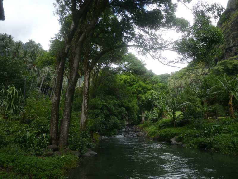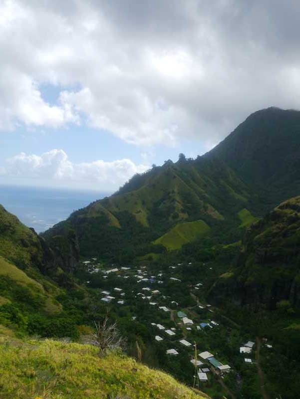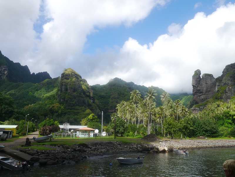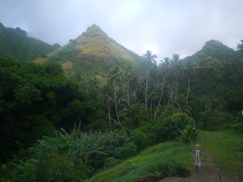 Hanavave, bukta vi ligger ankret i er omringet av bratte fjell som stuper ned i havet rundt oss. Det minner oss om å stå på tunet på Frigard i Lærdal, bare at vi er i tropene. Helt innerst i bukta gjemmer landsbyen Hanavave seg, bak en steinmolo som tar av for den verste svellen fra sør. Det bor et par hundre mennesker her og det er kun en vei som snirkler seg innover dalen mellom tilfeldig spredte hus og frodige frukttrær. Før du vet ordet av det har du gått gjennom all bebyggelse og lagt landsbyen bak deg. Der begynner jungelen og bratte fjell stiger til værs, først med irrgrønn vegetasjon, og på toppene er det bare stein igjen.