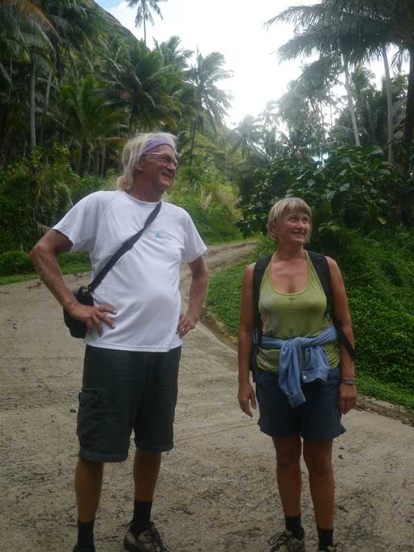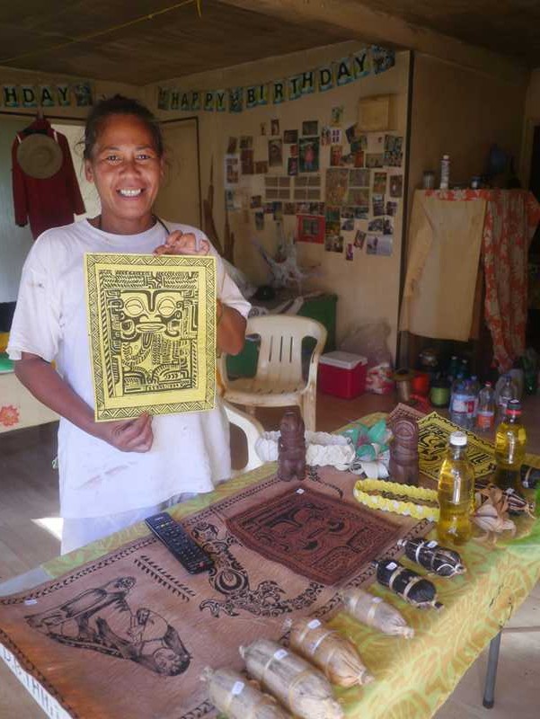 Vi er blitt litt kjent med et lokalt ektepar som antagelig gjør gode penger på oss båtfolkogså (bortsett fra oss uten cash, da. Men de har fått mye bra byttevarer!). De inviterer til grilling på stranden i landsbyen, et hyggelig initiativ. Vi har også vært hjemme hos Desiree og Jack, som de heter, og sett hvordan de lager tradisjonell lokal kunst. Jack skjærer ut Tiki, som er gudefigurer i tre. Desiree lager Tapa, som er illustrasjoner malt på trykket bark fra mulberry-, banyan- eller brødfrukttre. Vi har begge deler med i bagasjen hjem bytta mot noen gamle tau og tomme kanner.