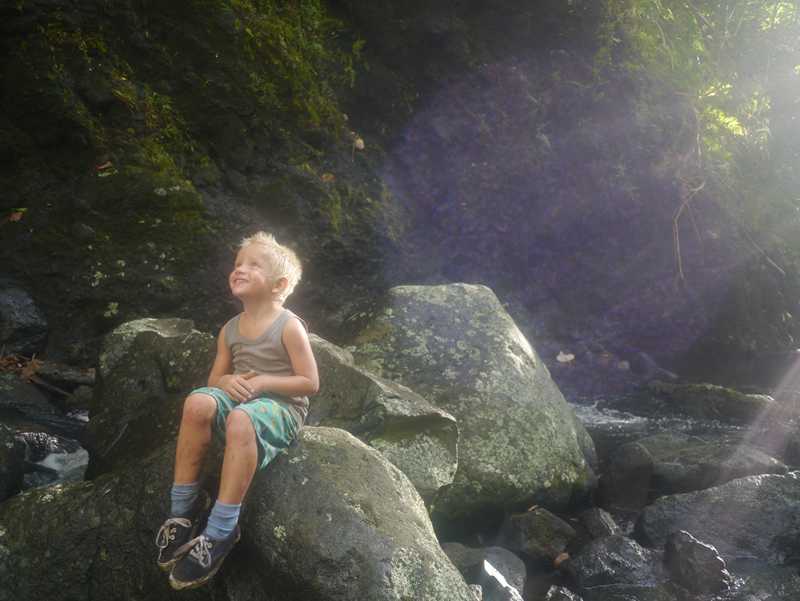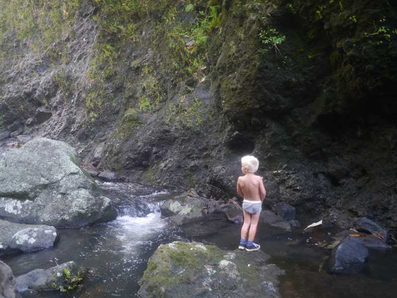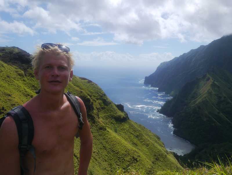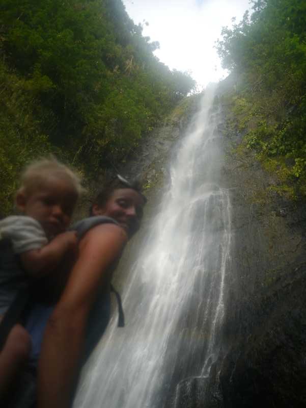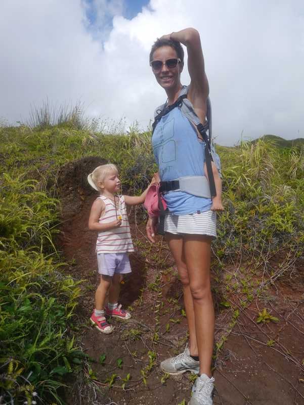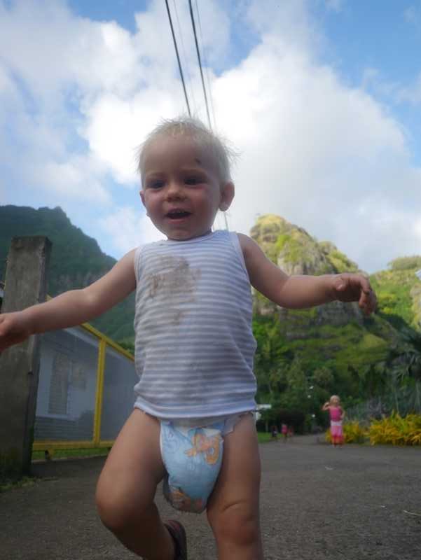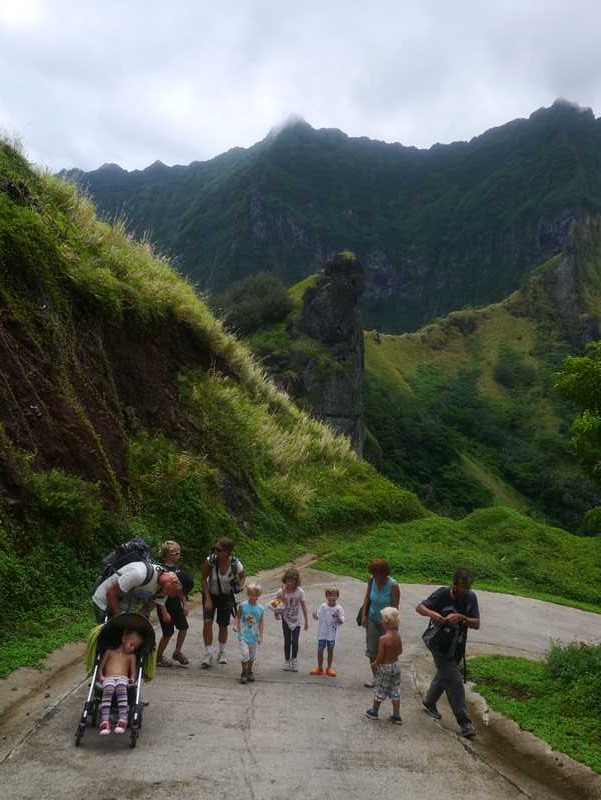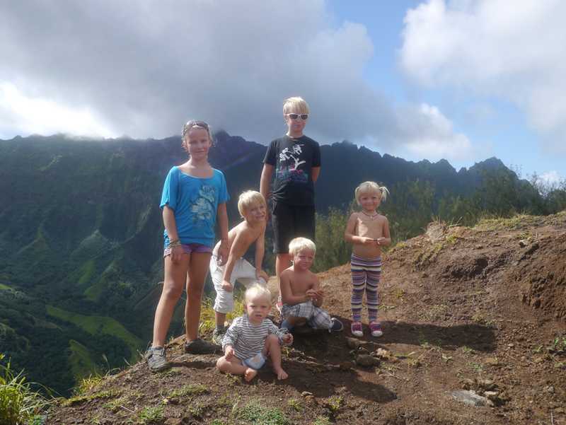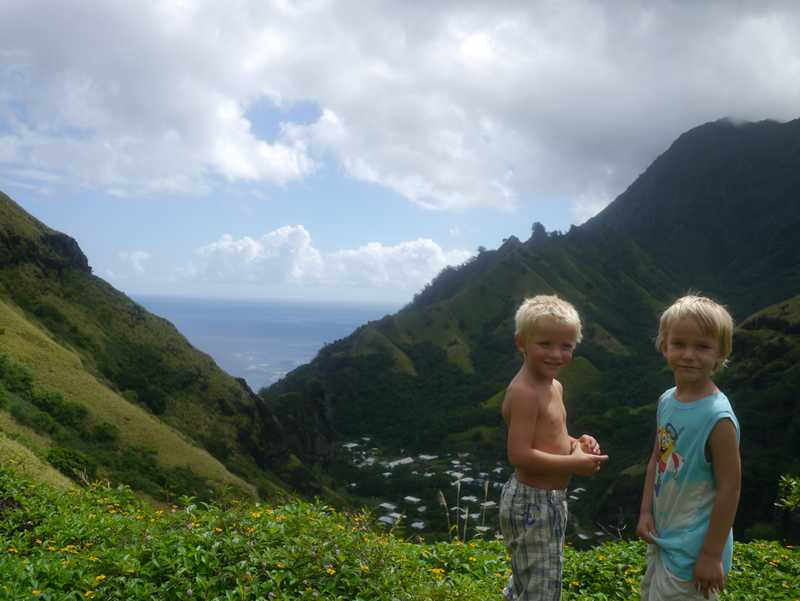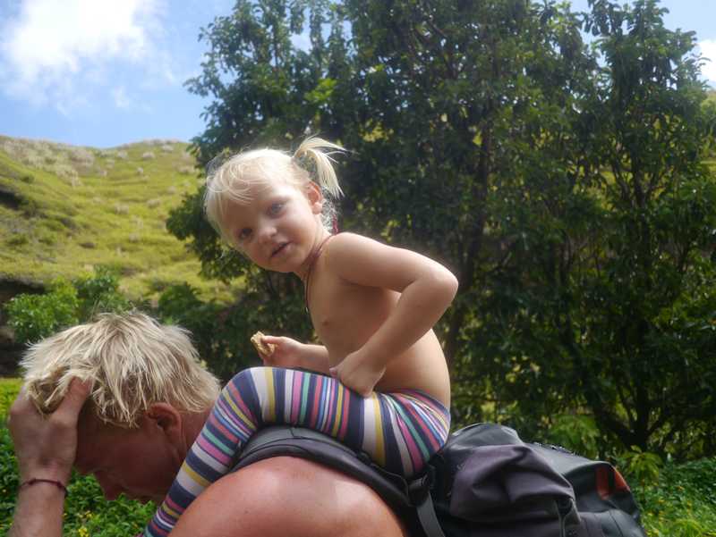 Vi har alle sammen vært på en av toppene som det er mulig å nå uten å risikere liv og helse. Følte oss skikkelig på team med de spreke og uredde fjellgeitene som lever høyt oppe i fjellet her. Med unger både på ryggen, skuldrene, magen og tidvis i vogn, sleit vi oss oppover bakkene sammen med gjengen fra Miss My. På toppen var det fantastisk utsyn, og der kunne vi tydelig se dette faktum at jorden ER rund. Foran oss lå det store blå Stillehavet, buet nedover i begge ytterkanter. Langt, langt nede i bukta under oss kunne vi se hvite små prikker av båtene våre for anker. Fett!