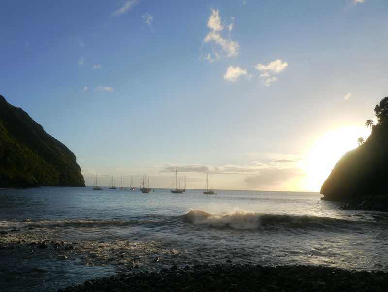 Også har vi fått en forsmak på den tropiske regntiden: Regnet øser ned over fjelltoppene, vanligvis er det bare en skur og to som treffer landsbyen og ankringsplassen hver dag. Men i dag har skurene kommet hvert kvarter, med sol i mellomtiden, og vi har åpnet og lukket luker som noen idioter her! Endelig klarnet det opp og vi nøt den flotteste solnedgangen, MEN sekunder etter var det bare å løpe ned å lukke alle luker som stod vidåpne for å lufte ut før natten…! Velkommen til tropene (glade vi ikke skal være her på Marquesas i regntiden…)!