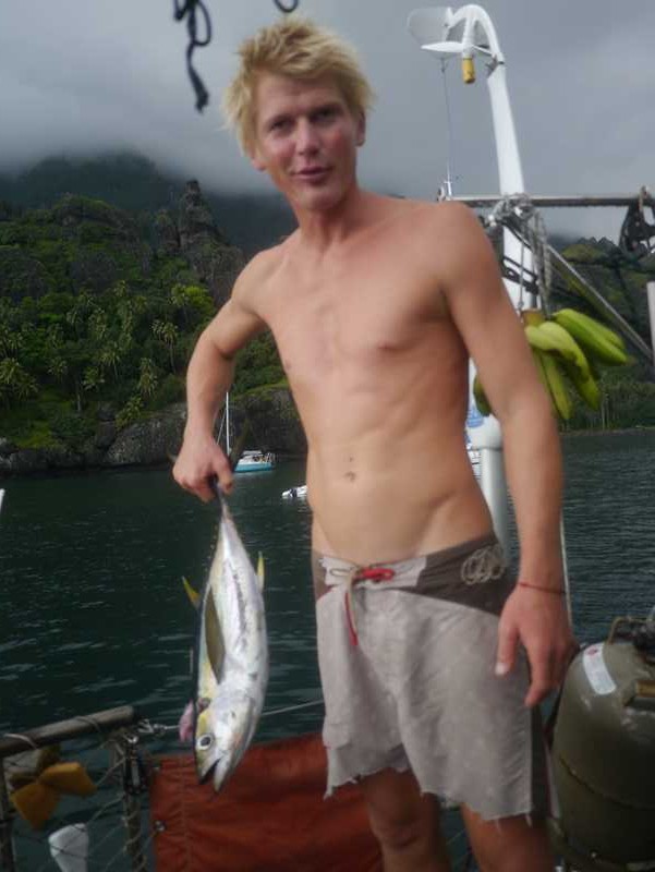 Rett før vi skulle gå inn i bukta Hanamoenoa på øya Tahuata, hvinte det i fiskesnella og etter en grei kamp kunne vi dra om bord en yellow fin tuna på over 7 kilo! En time etterpå spiste vi sashimi med Elisabeth og Per fra Oda i cockpit. DET er kortreist mat (og sinnsykt godt)!