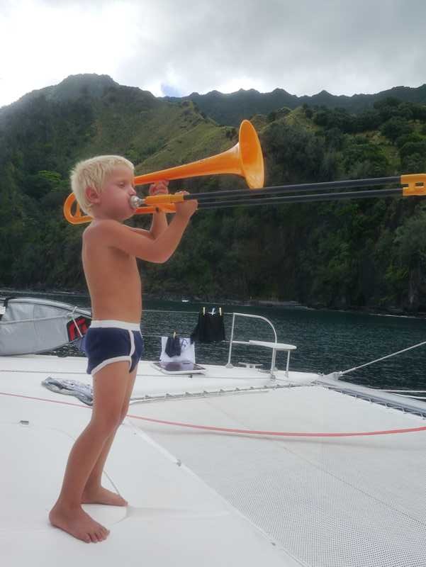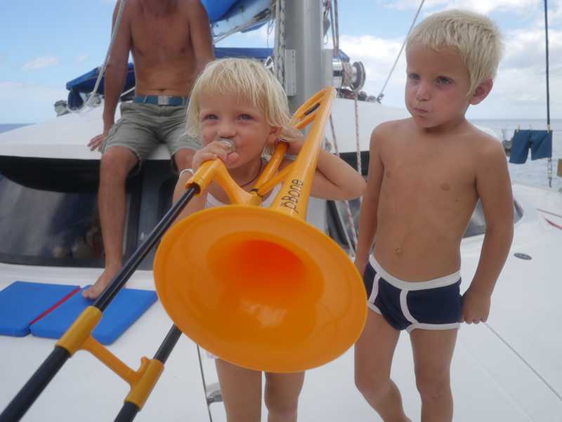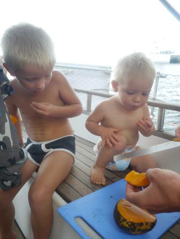 Vi er kommet inn i en fin morgenrutine om bord og en del morgener klarer vi faktisk å gjennomføre det også; pamplemousse + kaffe i cockpit i det verden våkner til liv, etter yoga på fordekk. Frokostsultne småmatroser stagges med bananer fra bananstokken som henger på hekken. Men så er det også de morgenene da ungene står opp før 06.00 og krangler uavbrutt, Mikkel tar selv av seg bæsjebleien i cockpit og tisser i sofaen rett etterpå (vel og merke etter at han er vasket fra første uhell!) – og alt dette FØR 08.00… Da er det bare å legge godviljen til og være glade for at vi i hvert fall var i seng før 21.00 kvelden i forveien!