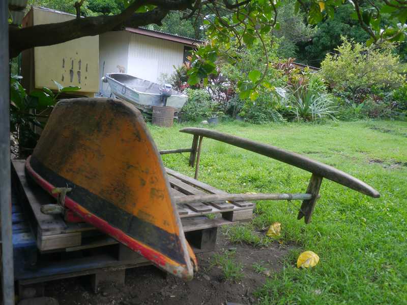 De er ikke så opptatt av penger (og om de er det så vil de ha polynesiske franc, noe vi ikke har…), men vi har blitt gode på byttehandel. De aller fleste har noe å bytte bort (det går mest i frukt og fisk) og alle vi har møtt er åpne for en handel. Hittil har vi byttet bort en del ting som vi har for mye av eller skulle kvitte oss med; fiskekroker, gamle dieselkanner (tomme), tauverk, tegnesaker, kritt, klær, sko og leker. For dette har vi fått pamplemousse, appelsin, sitron, lime, papaya, avokado, mango, fisk, kylling, basilikum, pluss tapa cloth og tiki (to typer lokal kunst). Beste byttehandel vi har gjort til nå er vel to gamle fendere mot en 7,5 kilos nyfisket yellow fin tunfisk, levert på dekk (= sushi, ceviche og tunabiffer)!