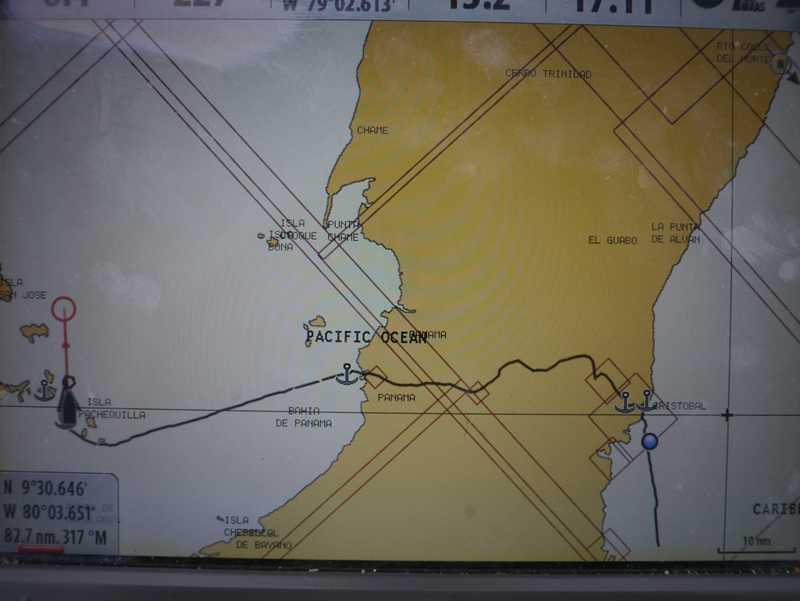 Nå blir det deilig å lette anker og seile fra denne skitne bukta. Første stopp på denne første Stillehavsetappen blir Las Perlas, en øygruppe som ligger rundt 40 nautiske mil herfra. Det skal være fantastisk og det blir nydelig med friskt og rent saltvann. Men vi hører at vi må belage oss på en kald dukkert… Tror det ligger på noen og tyve grader uti her, og det er ti grader lavere enn badetemperaturen vi hadde i San Blas (frem med våtdrakter…)!