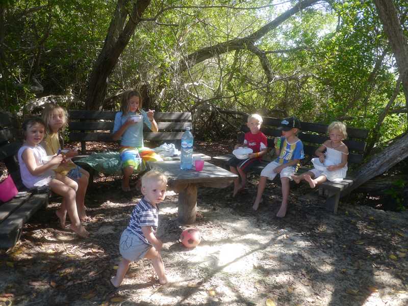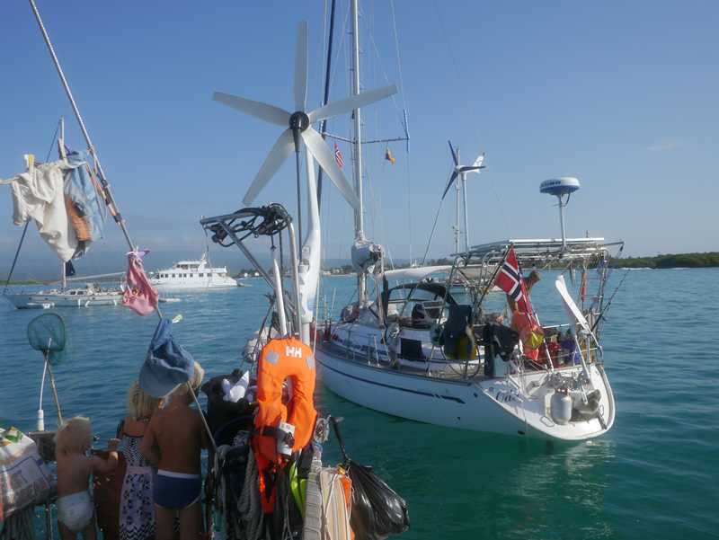 I tillegg til de franske båtene Gadjo Dilo (Lou 4år) og Lazuli (barn på 8 og 10 år), som vi ble kjent med i San Blas, har vi nå også hooket opp med enda en fransk båt, Maha Papou (med No-no 5 og Temoe 9 år), veldig fine folk som skal samme vei som oss! Det er også to svenske båter her som vi også har møtt før, trivelig! Miss My (med Gustaf 5, Lovisa 9 og Emil 11 år) og Salsa (med Andreas 5 og Erika 9 år), så her er det full barnecamp – fett for små og store! Også Oda selvfølgelig (som holder besteforeldrerollen ved like, i tillegg til sene kvelder i alles cockpiter og generelt morsomme påfunn. Per er ellers kåret til buktas mest ivrige på kanal 67!)
