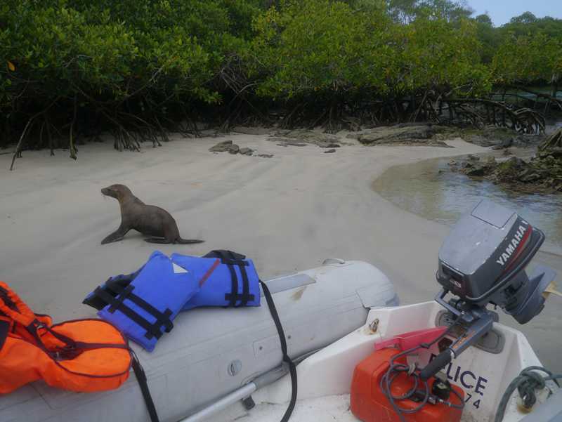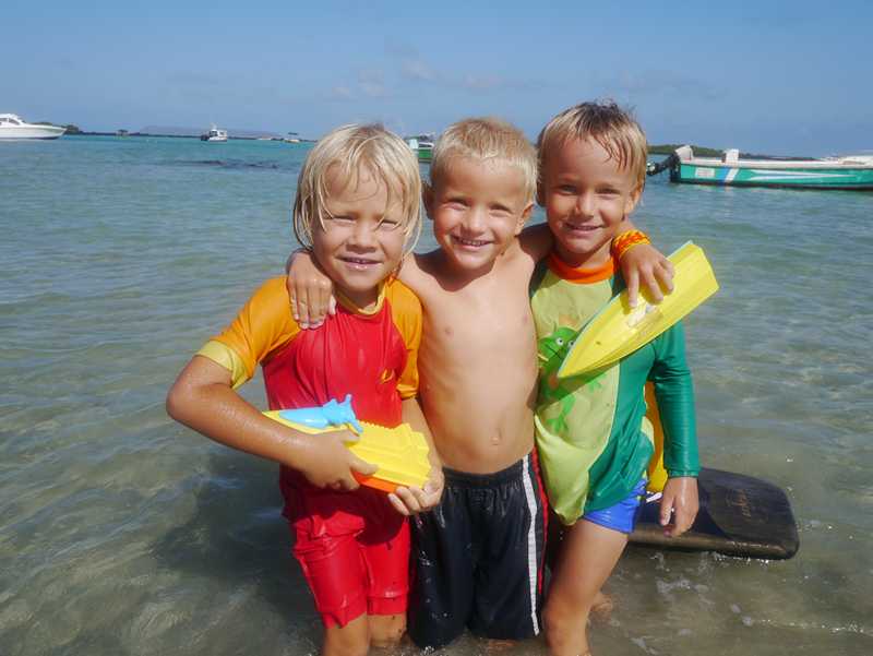 Her er det mye å gjøre, og det arrangeres turer for å se og oppleve alt livet på og rundt øyene her. Vi er med på en del, men det begrenser seg litt med tre kids fra fem år og nedover. Det er flere småbarnsbåter her, og vi gjør mye sammen. Har vært på skilpaddefarm, der de avler opp skilpadder for å øke bestanden på øyene, når de er fem år gamle slippes de ut i det fri. Billie vil selvfølgelig ha en liten babyskilpadde! Vi har vært ved Flamingos Lake og sett de rosa langbeinene (også på ønskelisten…). Og vi har gått en trebelagt vei innover i mangroveskogen til Concha de Perla, en stille bukt der man kan svømme med sjøløvene og pingviner – fett!