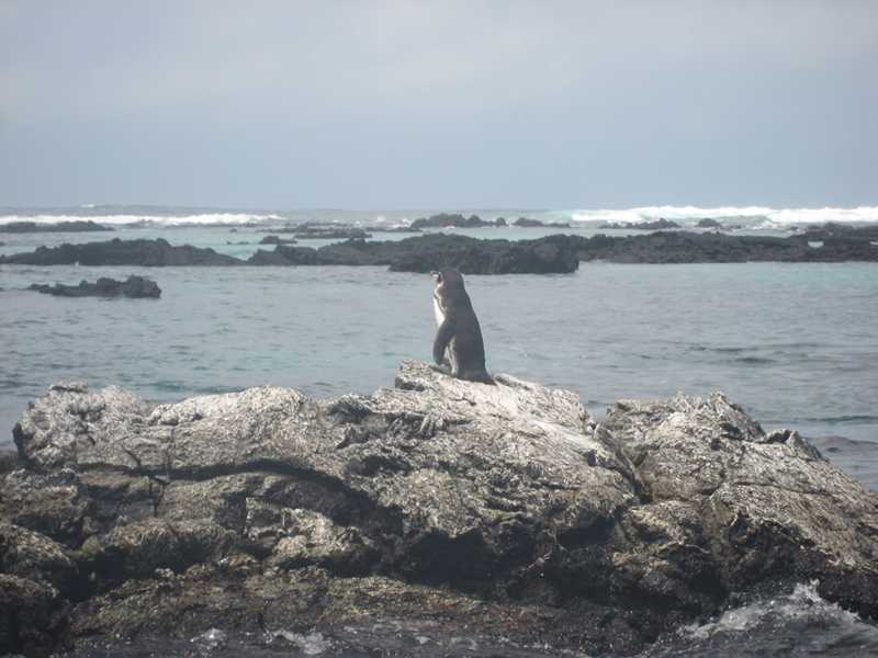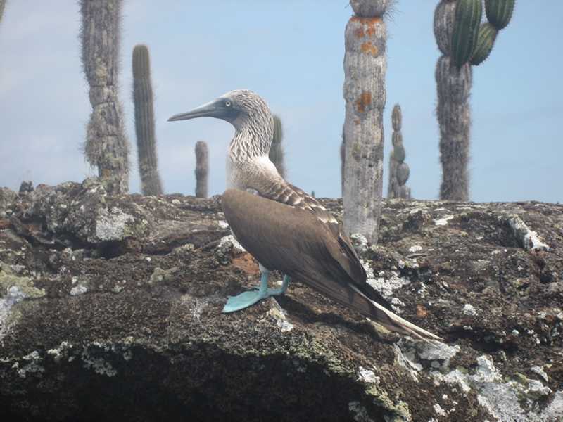 Når vi kommer i land må vi passe på hvor vi går, for ikke å tråkke på noen… Og vi må hoppe over sjøløver for å komme på land fra dinghy-brygga, det ligger store bulldoser-iguanaer og soler seg ved siden av der B+B bygger sandslott, pingvinene og sjøløvene bader rundt båten, og vi har pelikaner som sitter på baugen, som ikke bryr seg det spor om at Mikkel står 40 cm fra og peker og hyler av iver! Og selv om han er standhaftig og ganske tålmodig til å være ett år, så er det den store fuglen som vinner og Mikkel lunter bort etterhvert. Det er flokker med blåfot-fugl som stuper fra 50 meters høyde og treffer vannflaten som prosjektiler, før de kommer opp igjen noen sekunder etterpå med fisk i nebbet. Og det skjer rundt en meter fra båten. Jeg har aldri hatt den enorme dyrefascinasjonen, men dette er vilt!