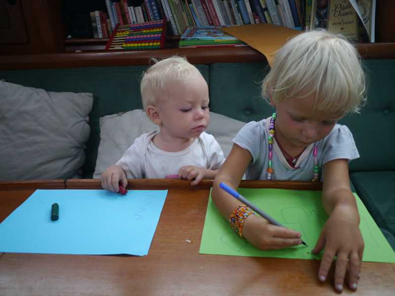 Det har vært litt partyparadis også, med mye kjente i båter rundt oss. Blue Marble (8 livslystne unge som følger i «Svanhild’s» forspor) har ligget en båtlengde fra oss, og vi har hatt skiftordning om bord der med kidsa som har vært på Mias maleskole og hoppet på trampoline på dagtid og oss som har drukket øl der på kvelds- og nattestid (slitsomt, men veldig hyggelig og moro)!