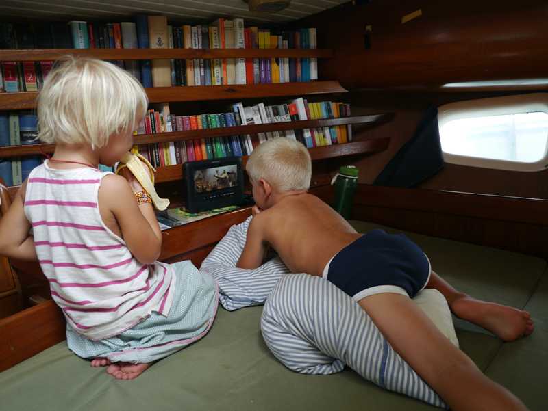 I dag fikk vi montert genoaskinnen på styrbord side (etter dekksreparasjonen), mens B+B så to filmer på rappen og vi prøvde å holde Mikkel i ånde med leker i salongen. Og i kveld har Jo med en del banning skrudd på plass taket inne i båten (der han har hatt mellom fire og syv cm til å feste de gjennomgående boltene til skinnen). Den har hengt utover byssa og gjort tilgang til kjøkkenskapene nesten umulig siden vi demonterte den på land i Shelter Bay Marina på andre siden av kanalen for tre uker siden (mens vi har hatt krydder og diverse tørrvarer i plastposer i forpiggen) – bra jobba! Dog med en liten bismak av glassfiberstøv-kløe, men sånn er det når man kombinerer småbarnshjem og båtbyggeri…