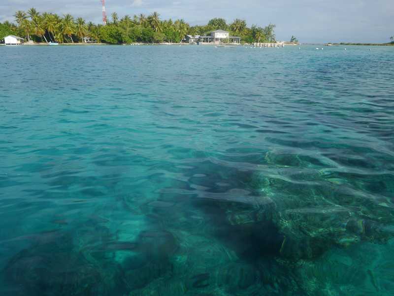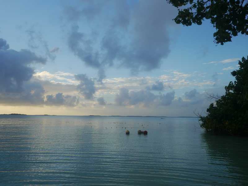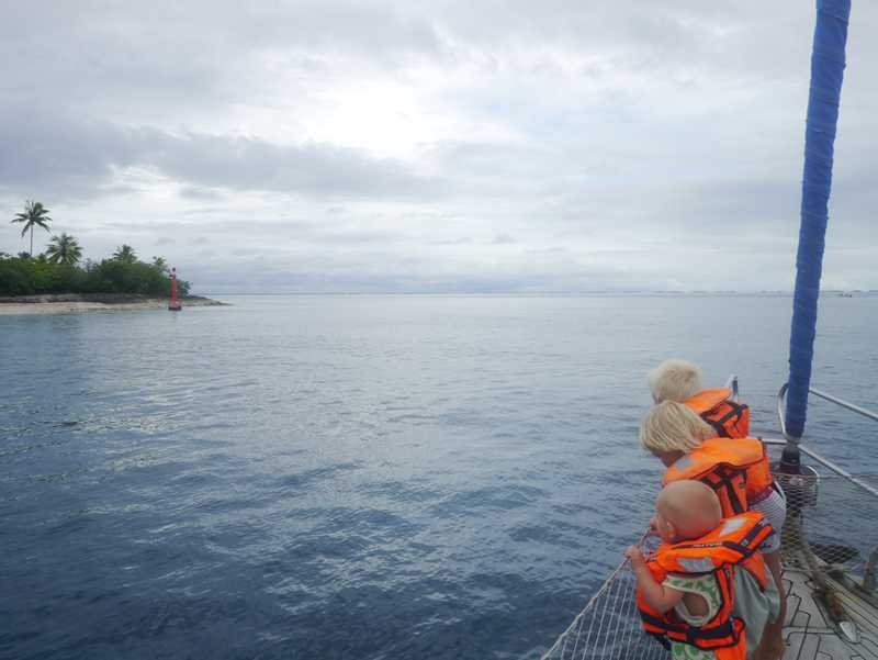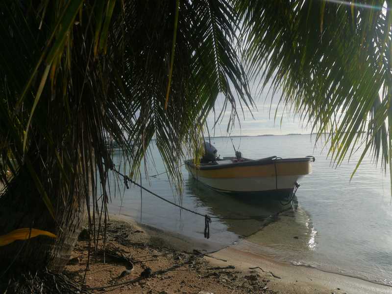 I det vi går gjennom passet i korallrevet åpner lagunen seg. I sirkel rundt oss ligger drøssevis av små lave palmeøyer. Det eneste som mangler er blikkstille klarturkist vann og en stekende tropesol… Vi har mer forhold som middels juli-vær i den norske skjærgården. Men Gudbrand kan fint se korallhodene mot sandbunnen fra sin utkikkspost ved første saling. Først dagen etter fikk vi se dette stille turkise paradis omringet av palmer som ser ut som de kommer rett opp av havet!