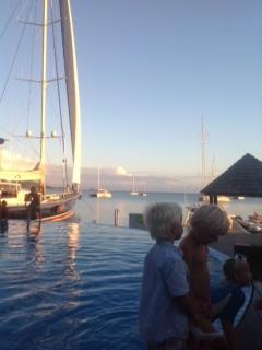Vi ligger for anker ved revet i atollen Tahaa, i det klareste vannet vi har sett så langt på turen. Det er fullmåne om tre dager, båten ligger i flomlys fra månen og selv etter at det blir mørkt kan vi tydelig se de mørke korallhodene mot den hvite sandbunnen rundt oss. Helt rått!