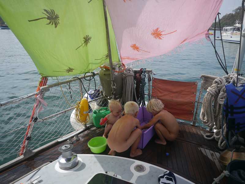 Nå blir det deilig å lette anker og seile fra denne skitne bukta. Første stopp på denne første Stillehavsetappen blir Las Perlas, en øygruppe som ligger rundt 40 nautiske mil herfra. Det skal være fantastisk og det blir nydelig med friskt og rent saltvann. Men vi hører at vi må belage oss på en kald dukkert… Tror det ligger på noen og tyve grader uti her, og det er ti grader lavere enn badetemperaturen vi hadde i San Blas (frem med våtdrakter…)!