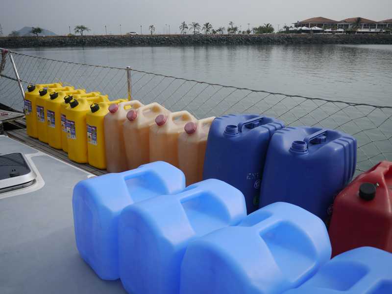 Ekstrakanner med vann, diesel og bensin (alt bortsett fra vannkannene får plass i stuerommet foran på dekk!!!)