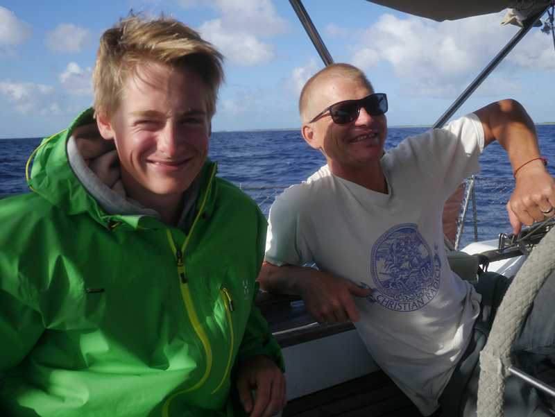 Ved laveste lavvann styrte vi rett mot den frådende åpningen i revet og surfet inn gjennom passet, med ganske hissige bølger og medstrøms. Vannet fosset om baugen og jo rattet intenst for å korrigere for strøm og bølger, mens Mikkel hylte av fryd, Birk skravlet uavbrutt og Billie utøvet en blanding av yaga og ballett i cockpit. Mama stod i baugen for å filme det hele (og holde utkikk) og helten vår Gudbrand gjorde sitt aller beste for å få Mikkel fra å svinge seg i bimini’n og ut på dekk, mens han videreformidlet beskjeder fra baugen. O herlige kaos! Men gjennom kom vi, og inni lagunen var det rolig og blikkstille vann.